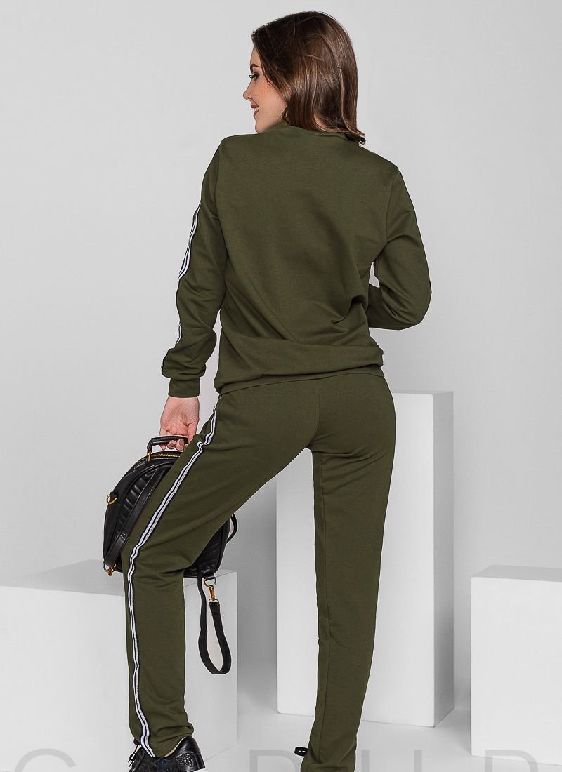 Comfortable knitted suit: bomber jacket with two welt pockets, contrasting trim on the sleeves, medium-fit trousers with elastic band, pockets in the seams on the sides and bright stripes.