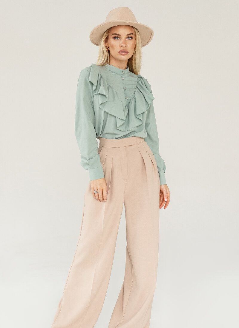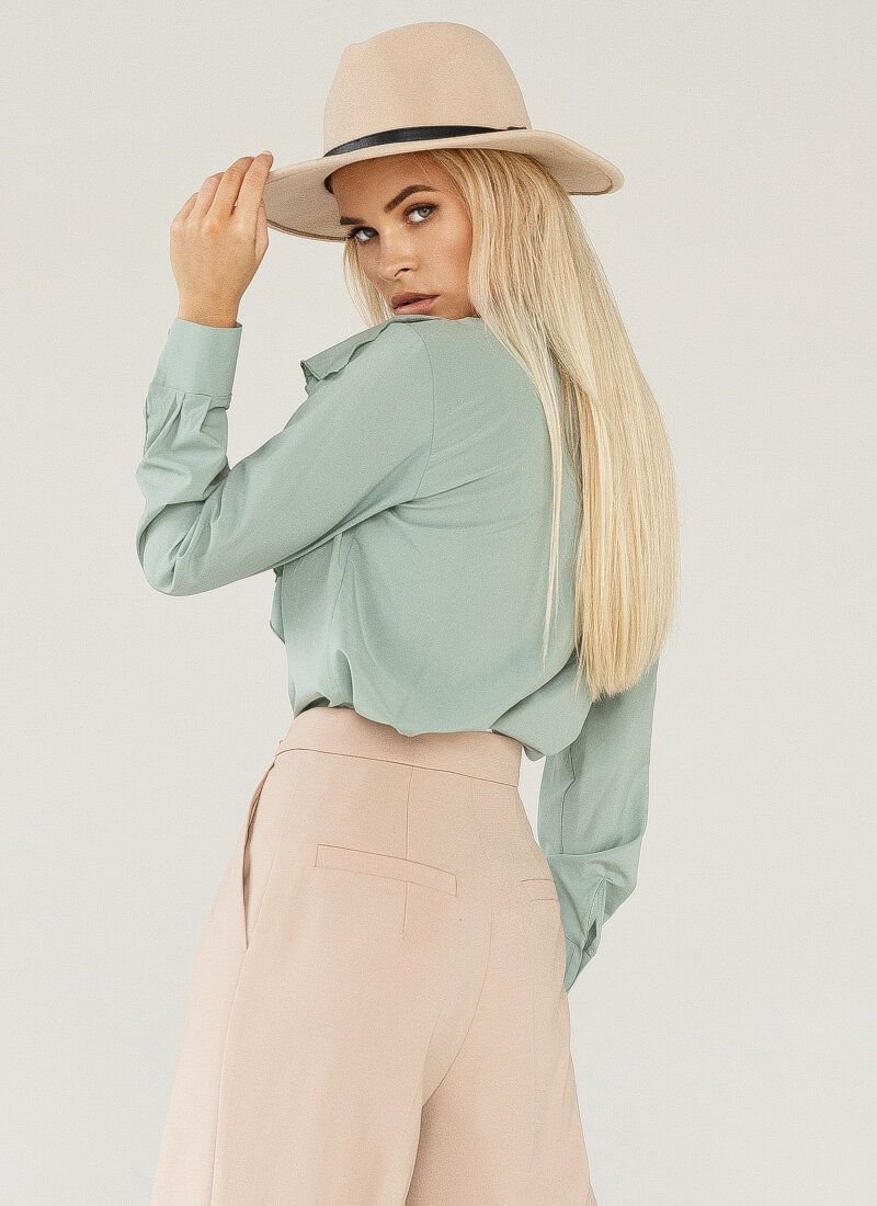 The mint-colored blouse was sewn according to all the canons of romantic style. It is based on a thin light fabric that fits nicely to the body like silk. The stand-up collar is adjacent to a lush flounce framing a triangular neckline area, complemented by a button placket.