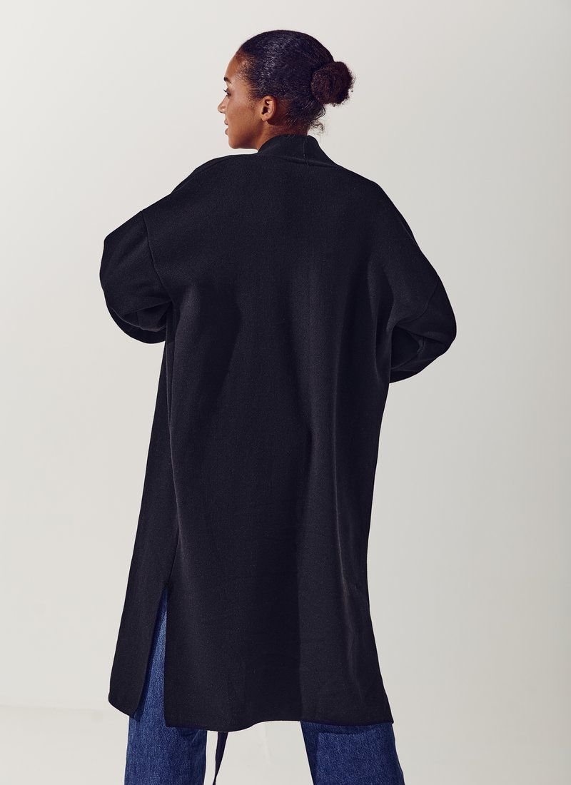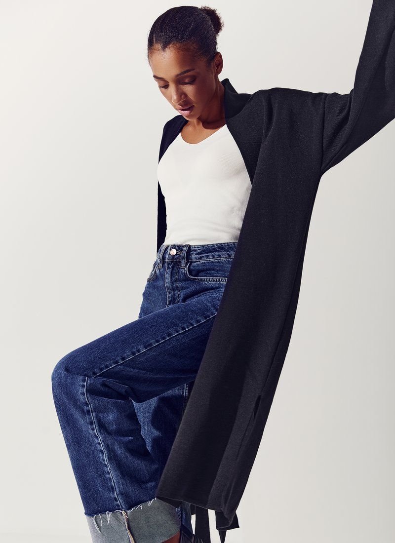 A basic oversize cardigan in knee-length black will add an accent to your look. The set includes a matching belt, and the model is stylized with slits on the sides.