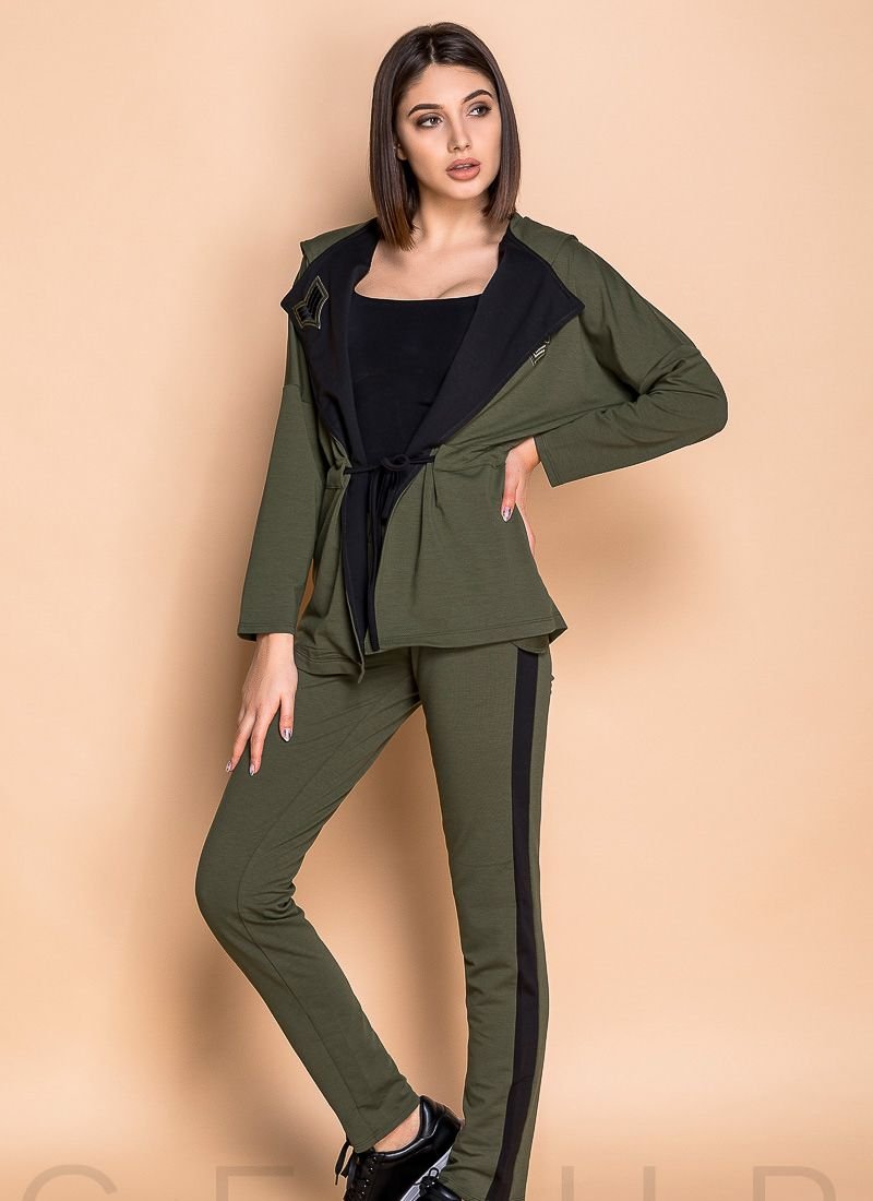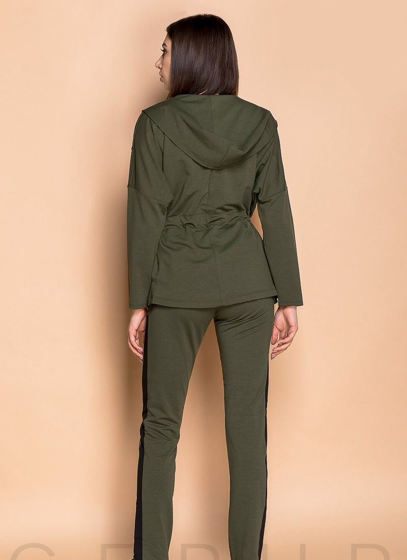 Stylish military-style suit: a cardigan with a one-piece sleeve and a lowered shoulder line, a hood, contrasting lapels with a patch, pockets in the seams and drawstring ties, trousers with an elastic waistband and stripes.