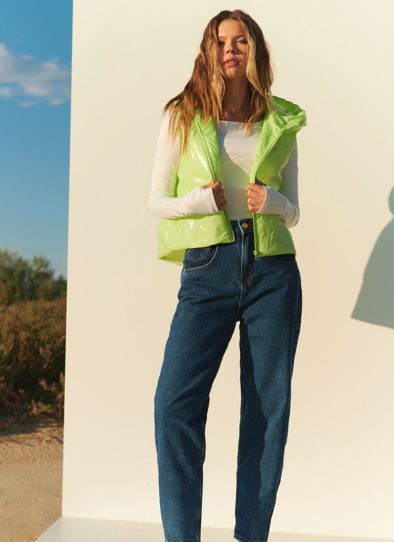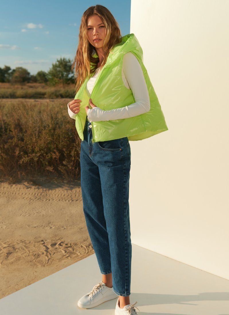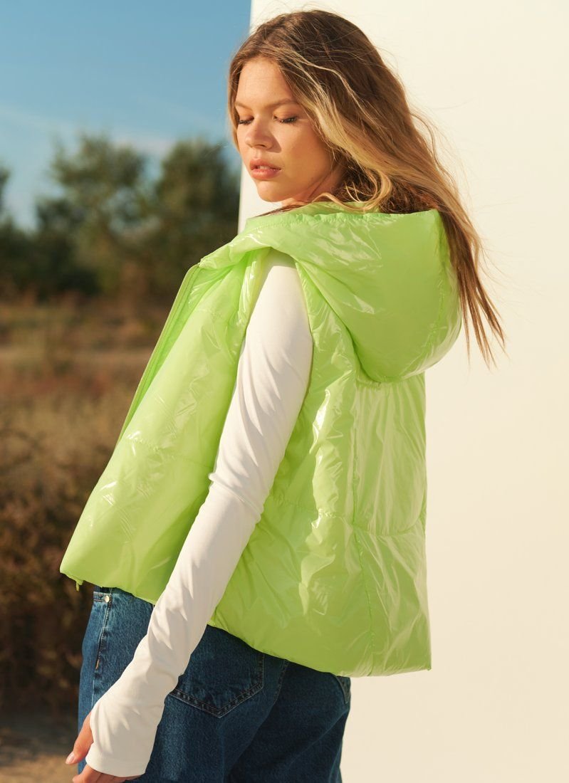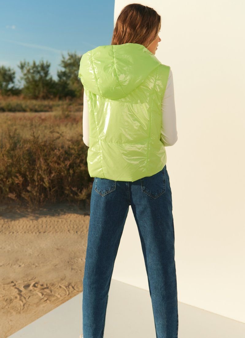 Light green vest made of raincoat fabric with zipper and hood. Features: the role of insulation is sintepon (100 g/m2). Please note that the product is designed for temperatures up to +5 ° C.