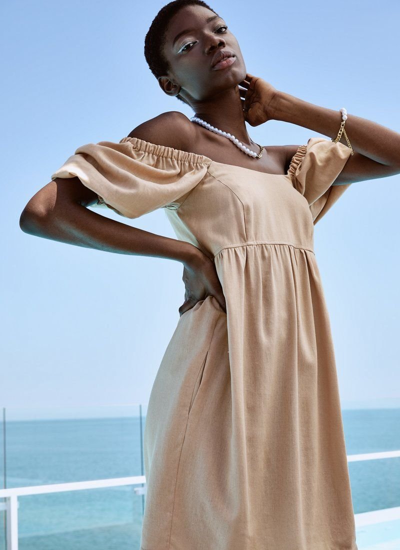 Beige dress successfully copes with multitasking, organically fitting both into the image for relaxing by the sea and into everyday look. For sewing a model with an open shoulder line and voluminous sleeves, a light material was chosen - eco-linen.