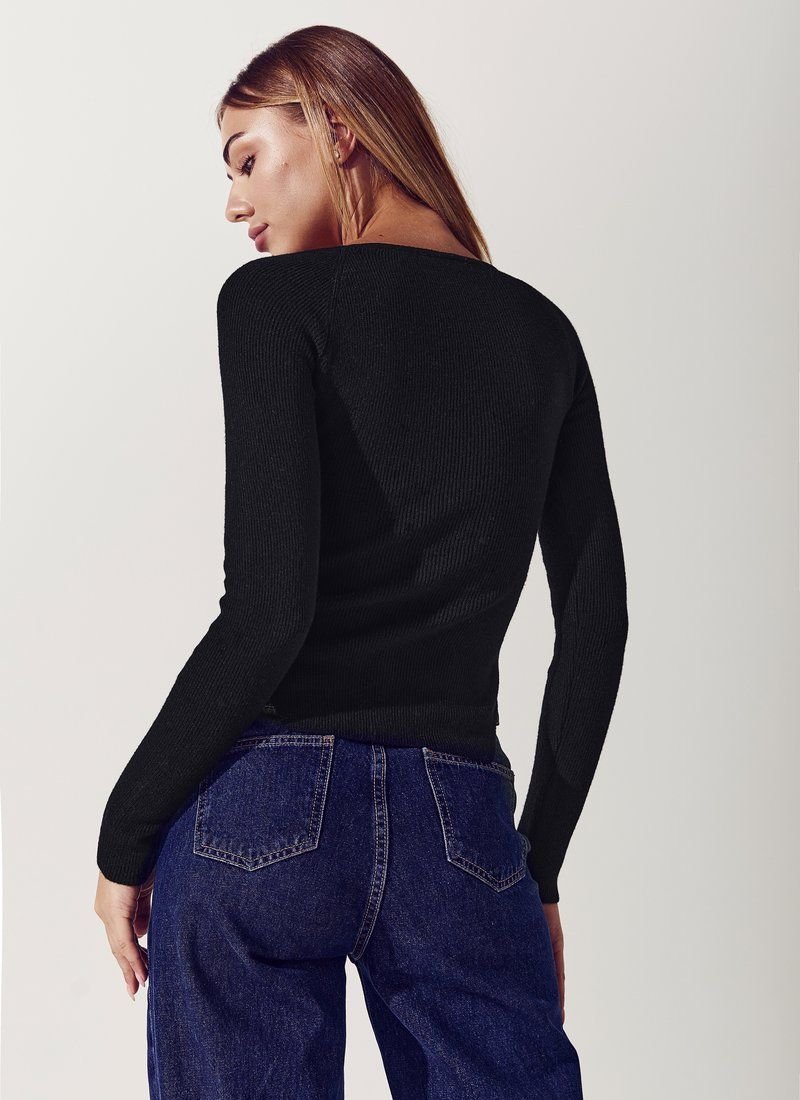Stylish black longsleeve with a curly neckline. The model is made of soft knitwear, decorated with slits on the sides.