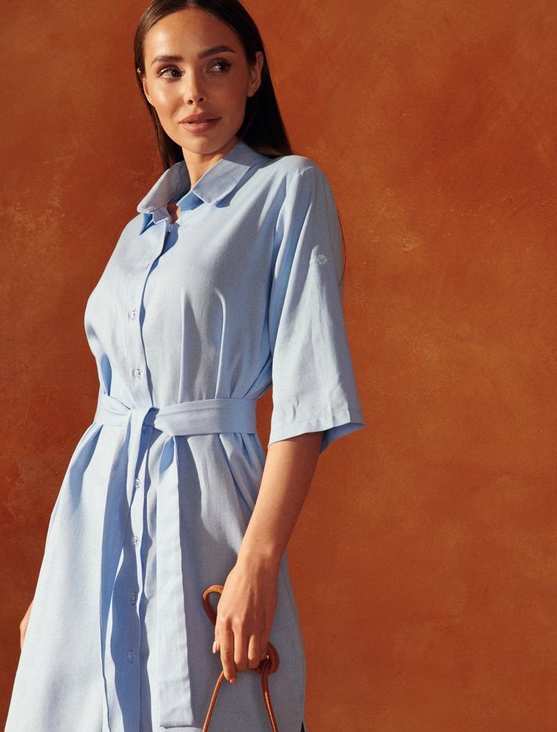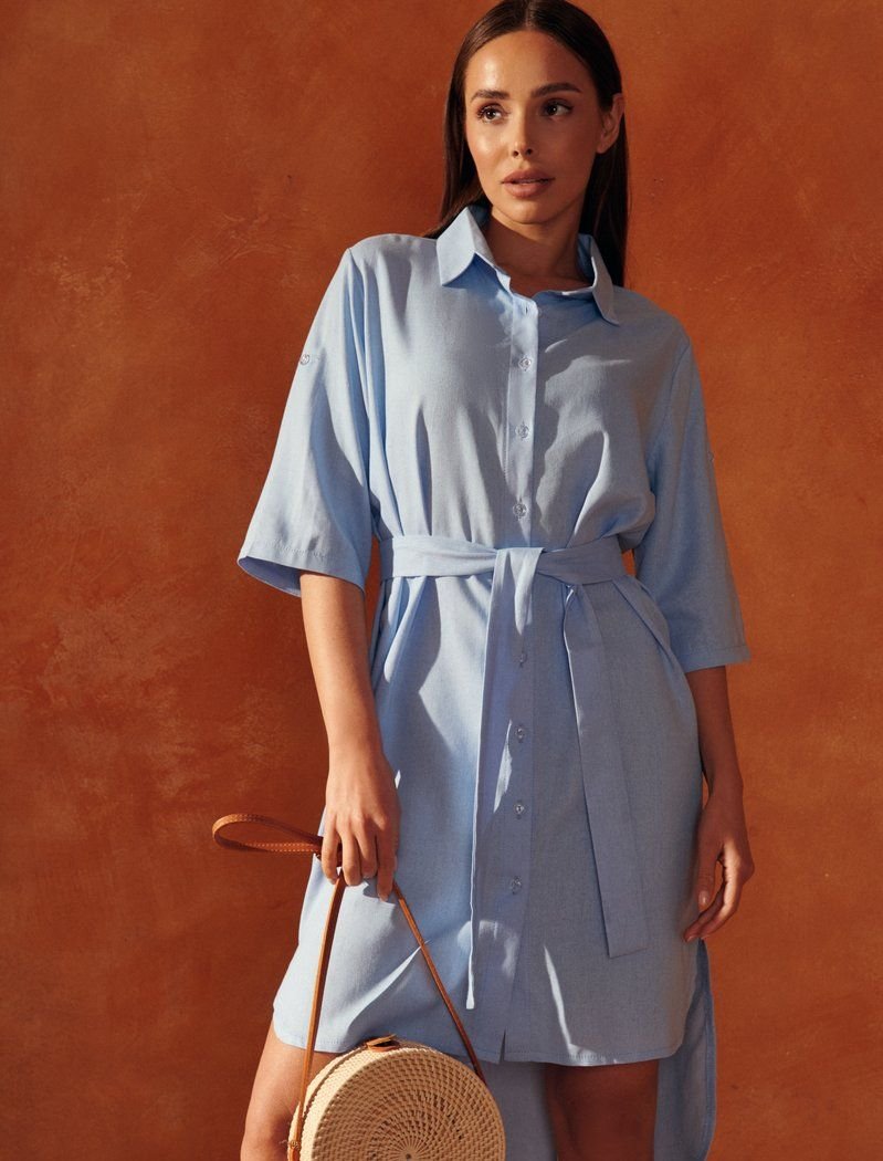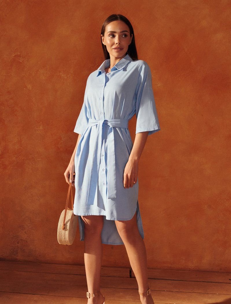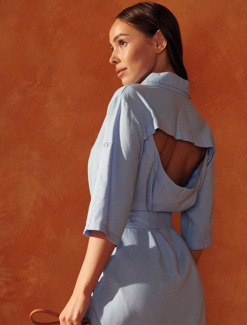 At the seasonal shows of FW20/21, Celine and Chloe included shirt dresses in their collections. An asymmetric blue model with short sleeves with patch fasteners is complemented by a cutout on the back. The waist is formed by a removable belt-ribbon.