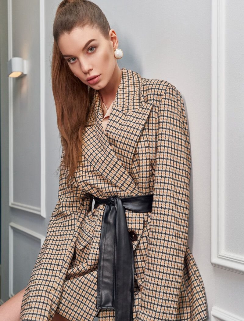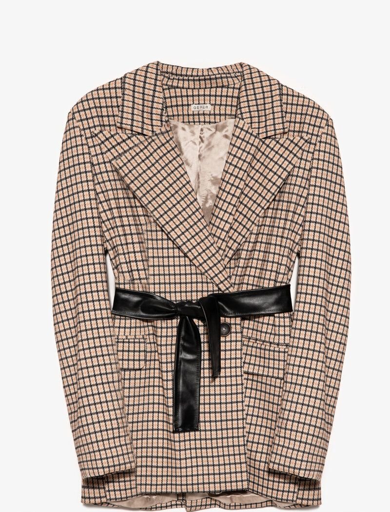 Checkered single-breasted jacket in the style of dadkor ("dad's jacket") on a satin lining. Classic turn-down collar|pointed lapels. Elongated cut. Modeling foam inserts in the shoulders|long sleeve. A button placket on the front|two welt pockets with a flap and a removable belt made of eco-leather.
