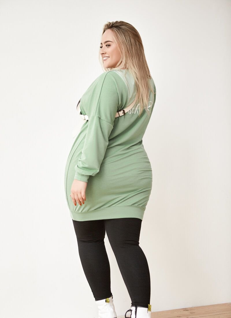 The mint tunic resembles a loose hoodie without a hood. A zippered patch pocket on the front and a decorative insert with a print on the back act as a decor. Elastic cuffs on the sleeves and the bottom edge provide a comfortable wear.