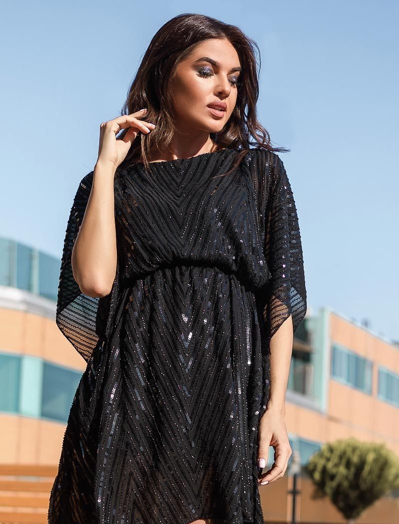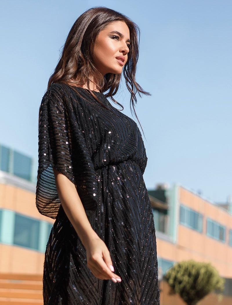 Decorated evening dress with wide kimono sleeves and slits on the shoulders, made of mesh and embroidered with beads and sequins: a rounded neckline and a loose yoke; there is an elastic insert on the belt. .