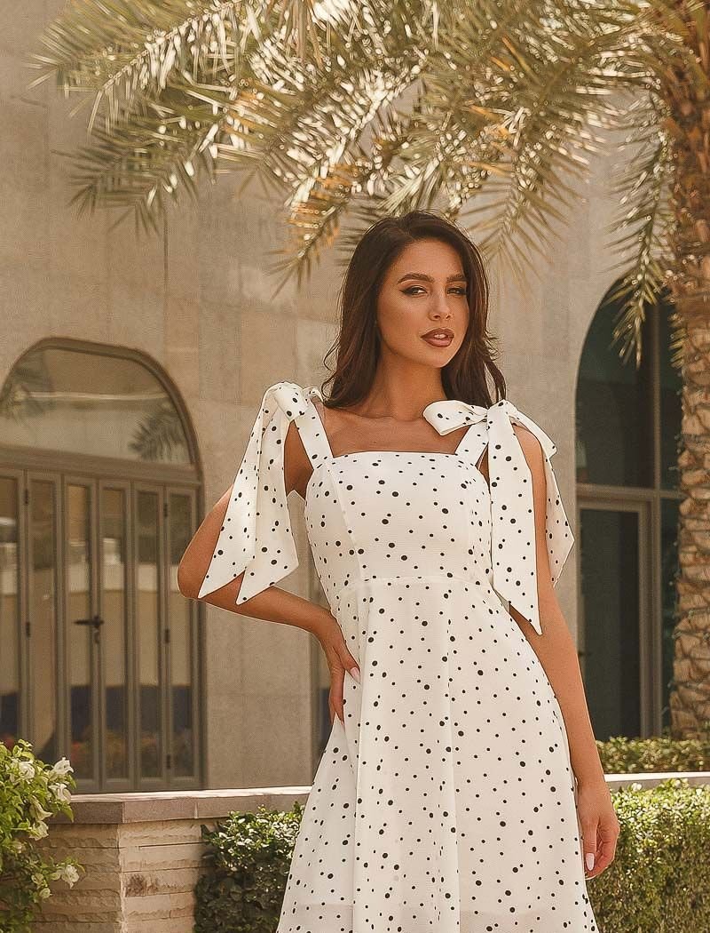 A dress in a trendy pea print of contrasting color, made of weightless chiffon fabric, from Gepur designers: wide non-adjustable straps with decorative ribbons, a square neckline, a cut-off waist and a short half-sun skirt in a light fold.
