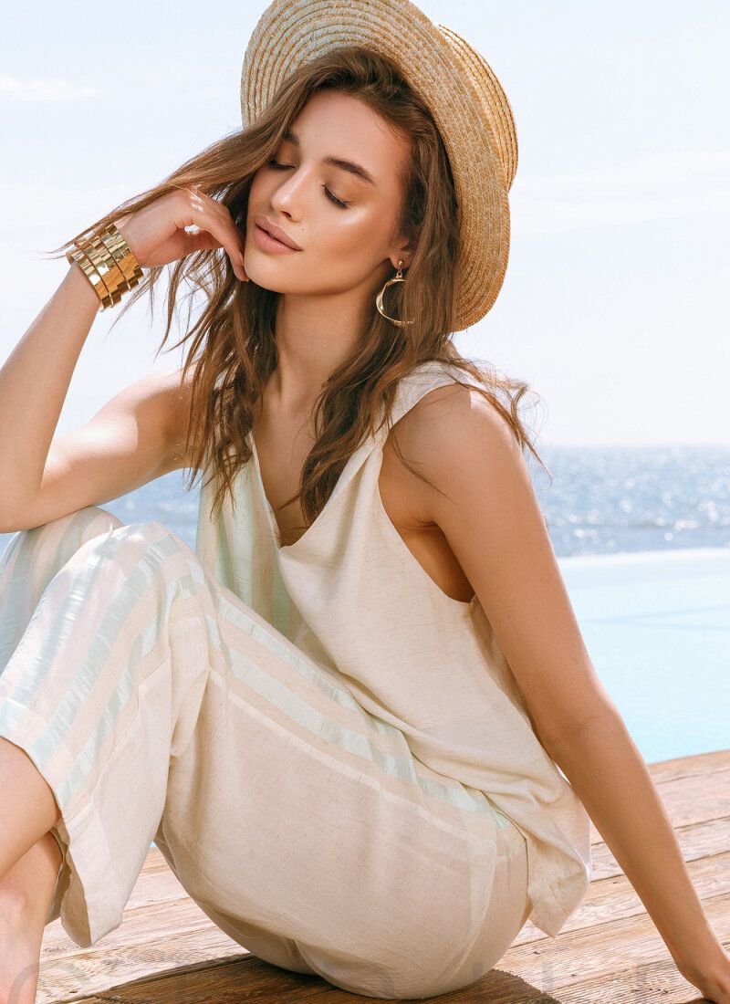 A comfortable loose-fitting suit made of eco-linen in a milky shade, complemented by blue vertical stripes. An elongated T-shirt with a v-neck on wide straps, loose trousers with an elastic insert at the waist.