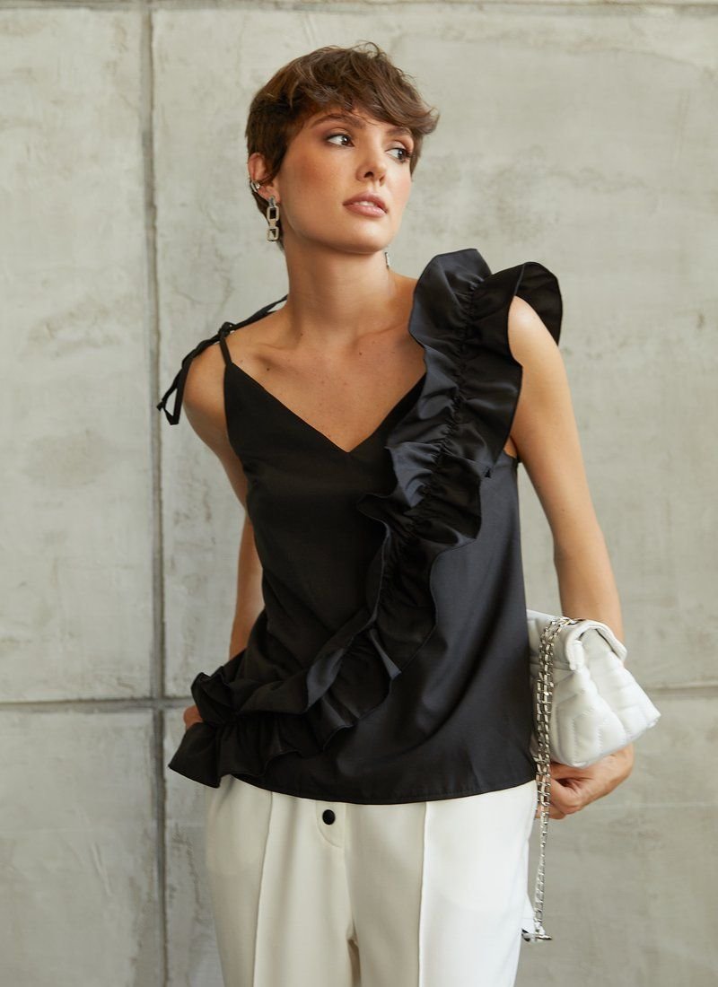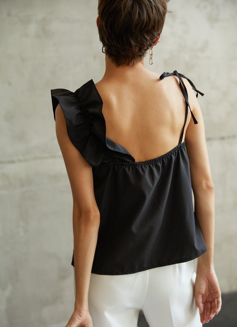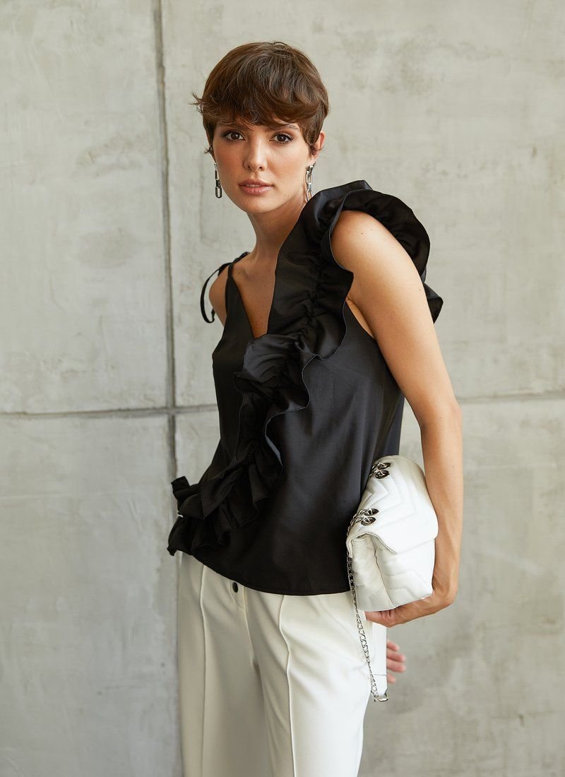 Stylish blouse of a loose cut with a v-neck, decorated from the shoulder diagonally with voluminous flounces. On the right shoulder there is a thin strap with a drawstring, and on the back there is a neat elastic insert. This blouse will perfectly complement any of your looks and will be a good choice for a warm summer.
