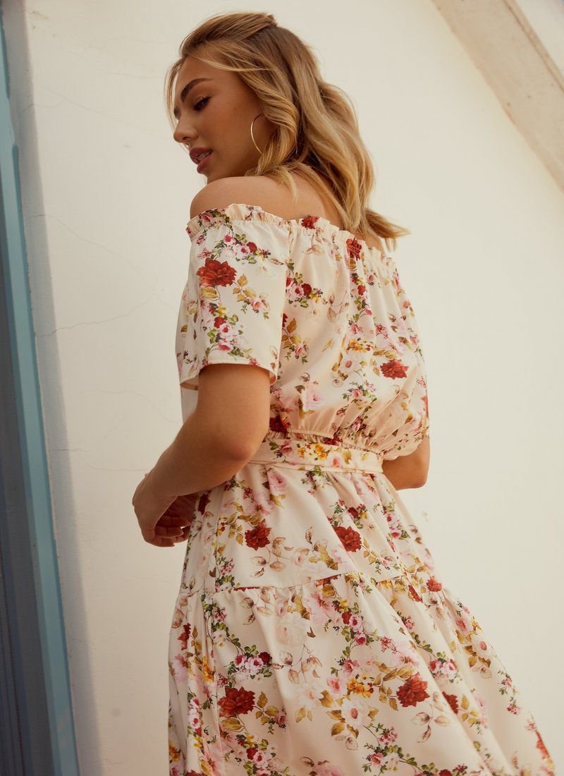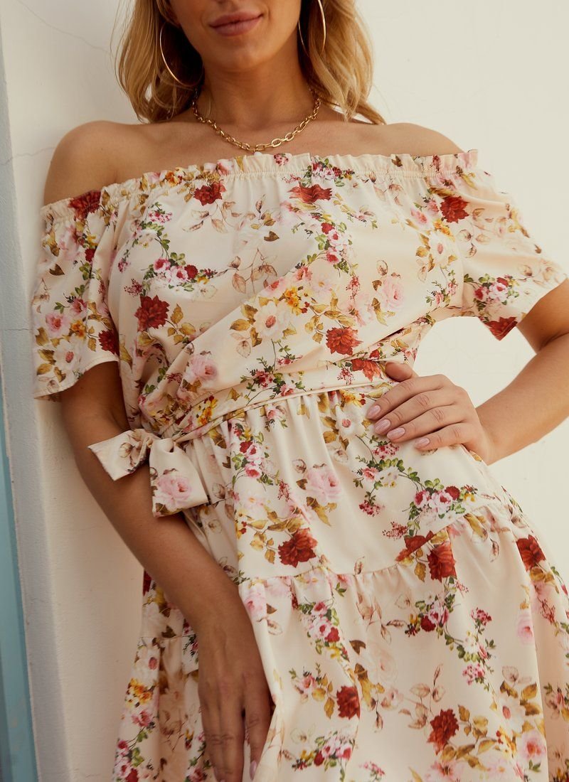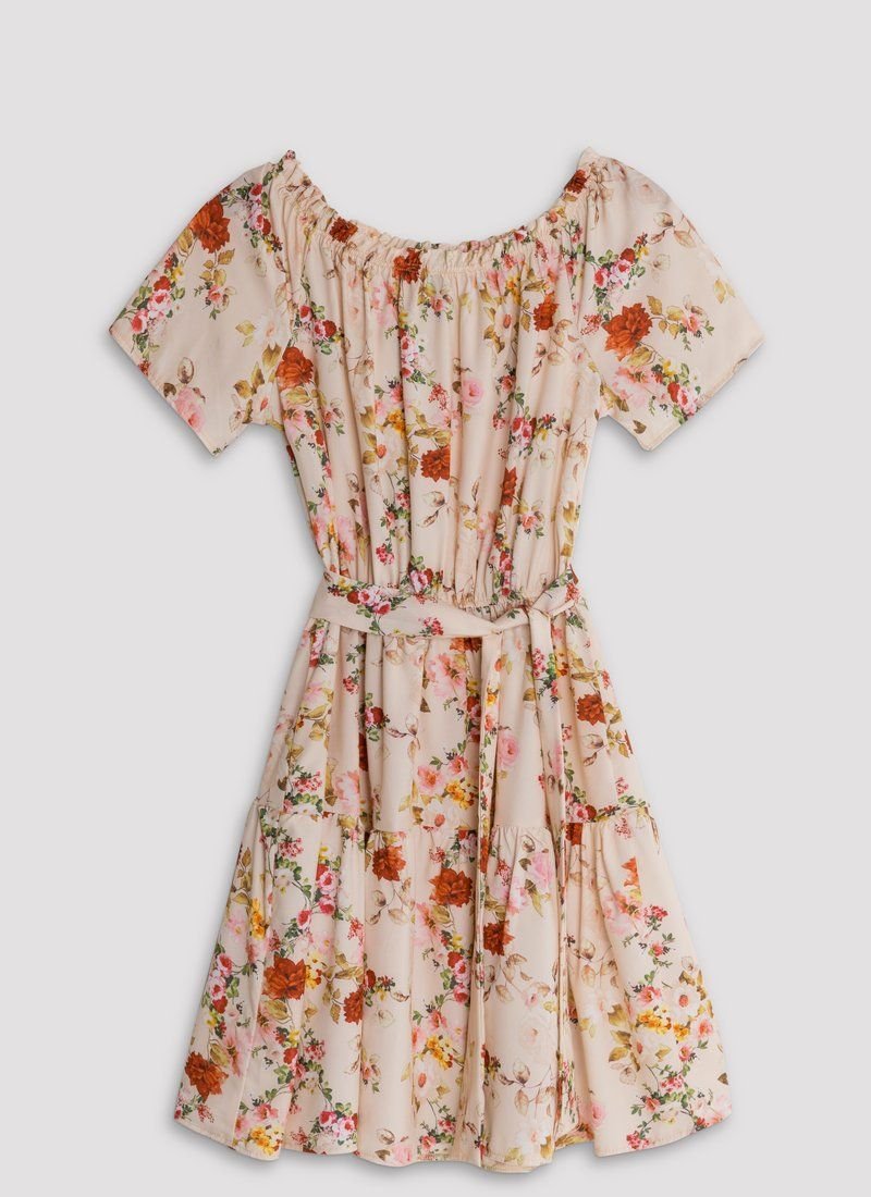Romantic summer dress made of flowing fabric with floral print. The wide boat neckline is complemented by an elastic insert that allows you to wear the dress, revealing the shoulder line. a flared sleeve, a closed elastic band at the waist and a short flared skirt. The set includes a belt-ribbon to match the dress.