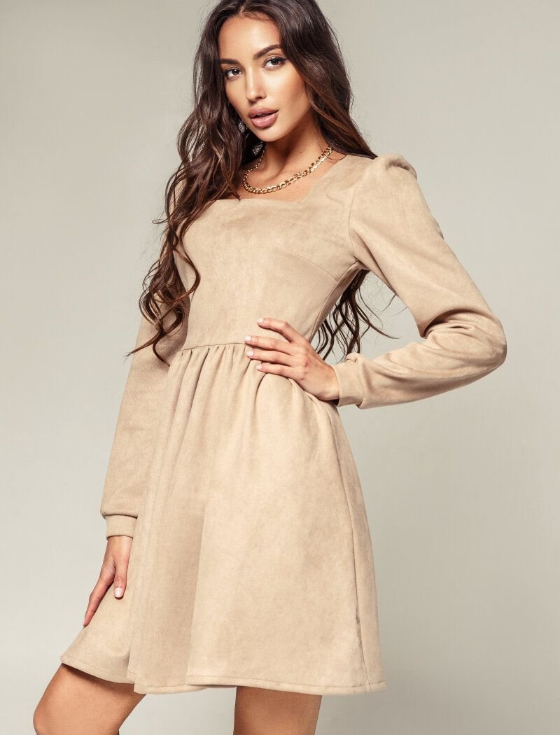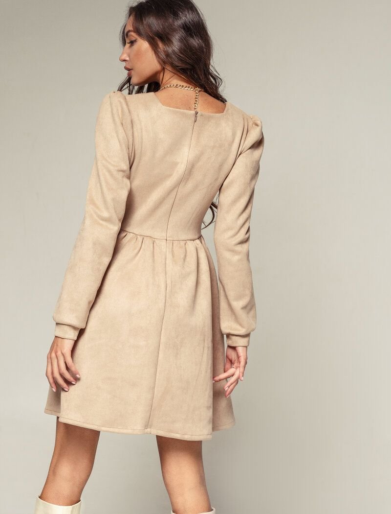 The beige mini dress combines two trends at once: a soft suede texture and voluminous sleeves in the spirit of FW 2020/21. A fitted cut with a flared skirt forms a feminine silhouette. The cleavage area is emphasized by the square neckline.