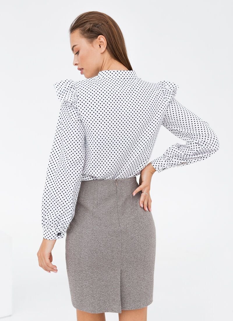 The white blouse supports the romantic trends of 2020 - pea print and flounces. The model was complemented with wide sleeves at the cuffs and a stand-up collar.