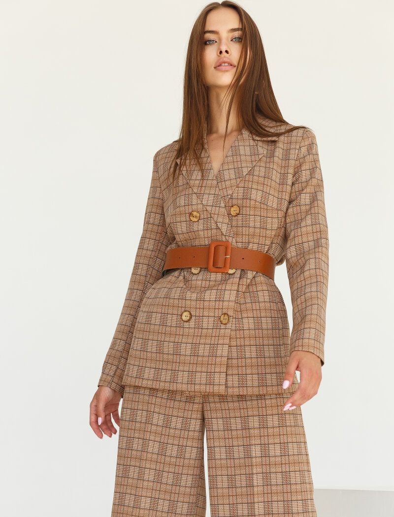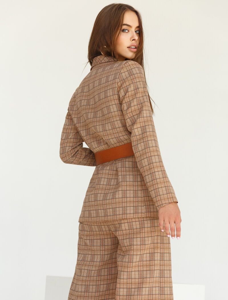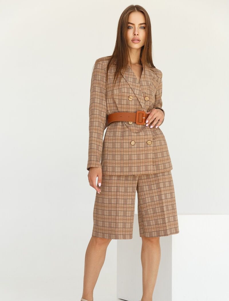 Long shorts with a checkered print are stylized as classic trousers. The belt has pinches that accentuate the waistline. A model with a comfortable inflated fit. Shorts will become an alternative to a skirt in the image with a top, T-shirt or blouse.