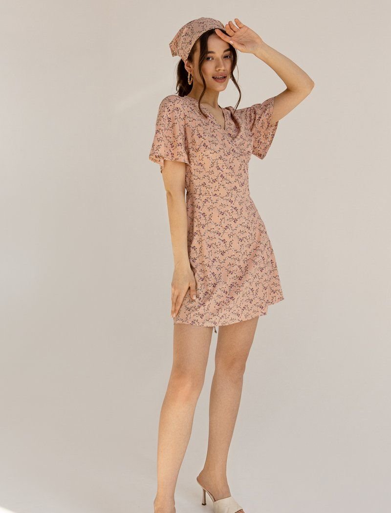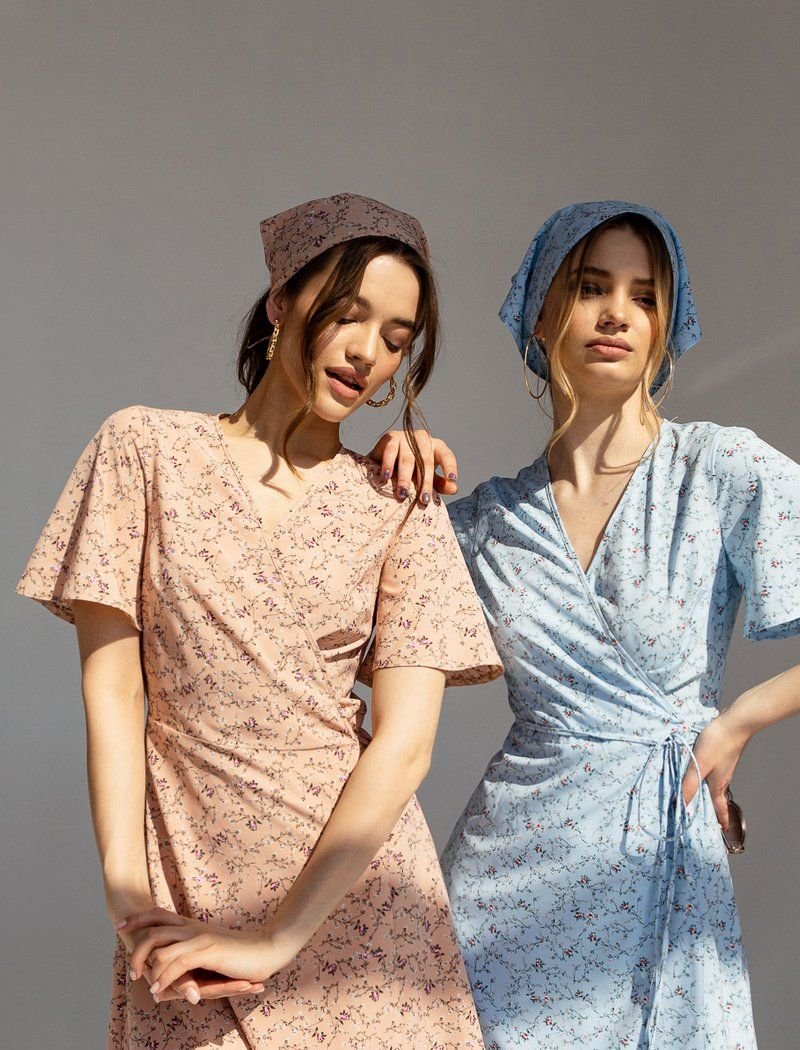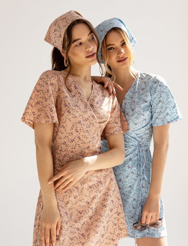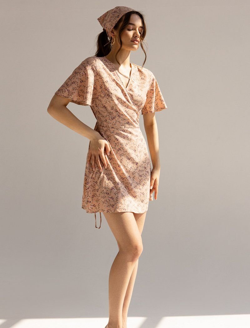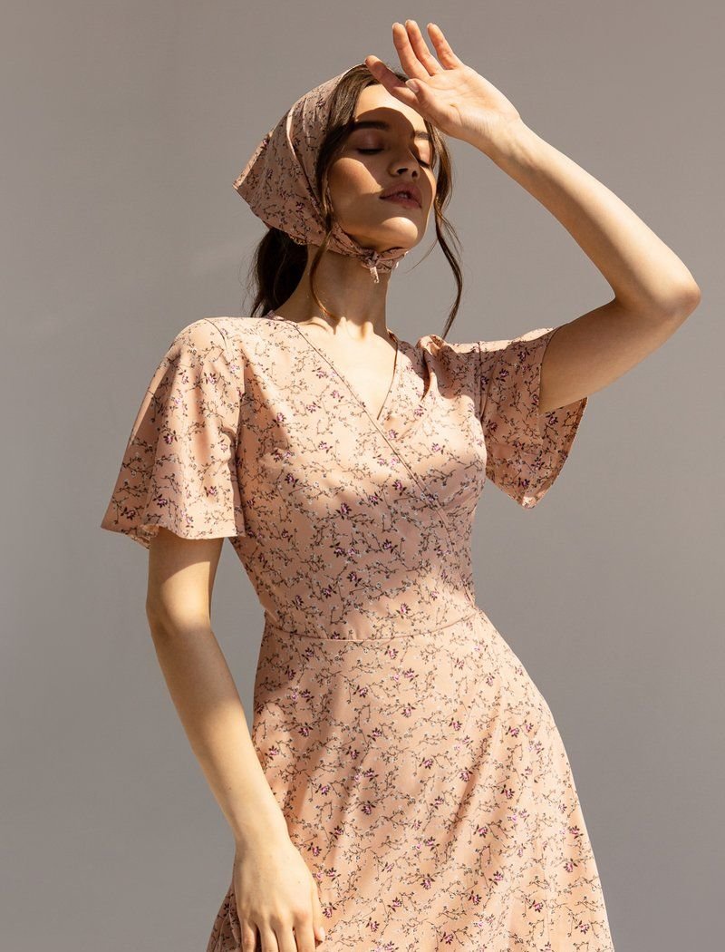 Thanks to the universal cut on the back?x, a peach mini dress is suitable for all types of figures. The key element of the model was a delicate floral print, which in the SS21 season is found at the shows of Valentino and Balenciaga. As an additional accessory, the product was supplemented with a kerchief.