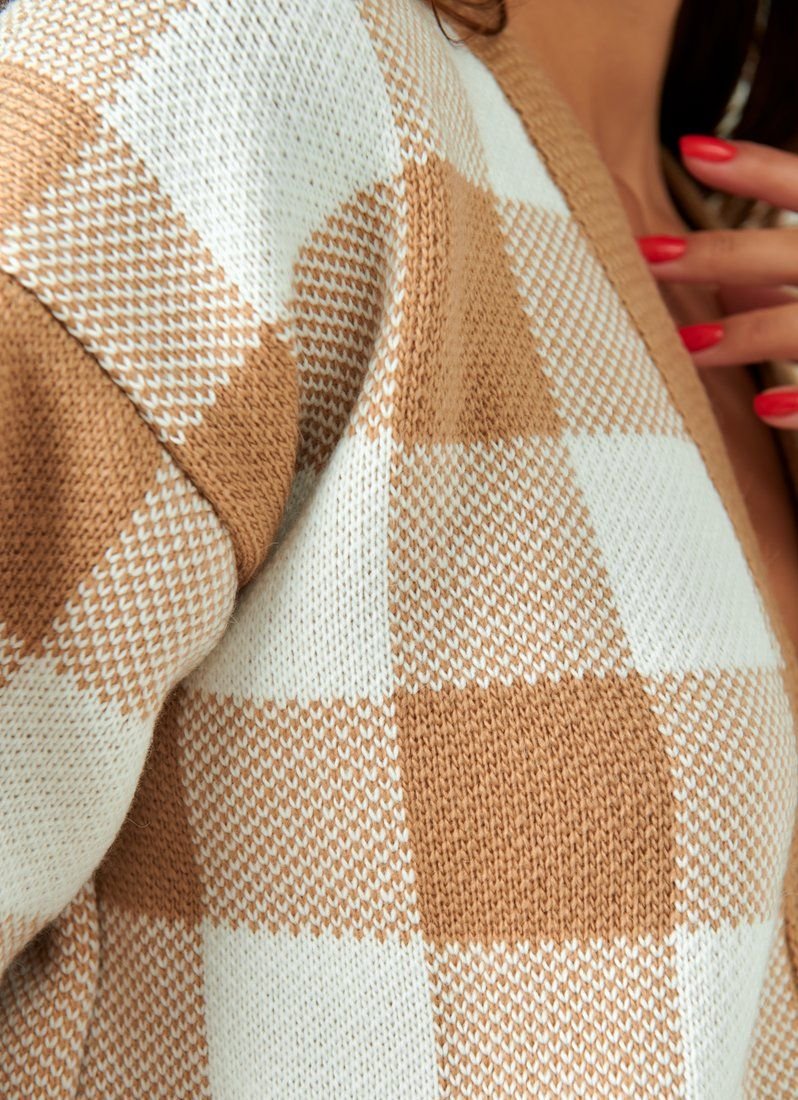 Beige wool jumper in a large white check. In this model there are round sperdi buttons, which are stylized as a tree.