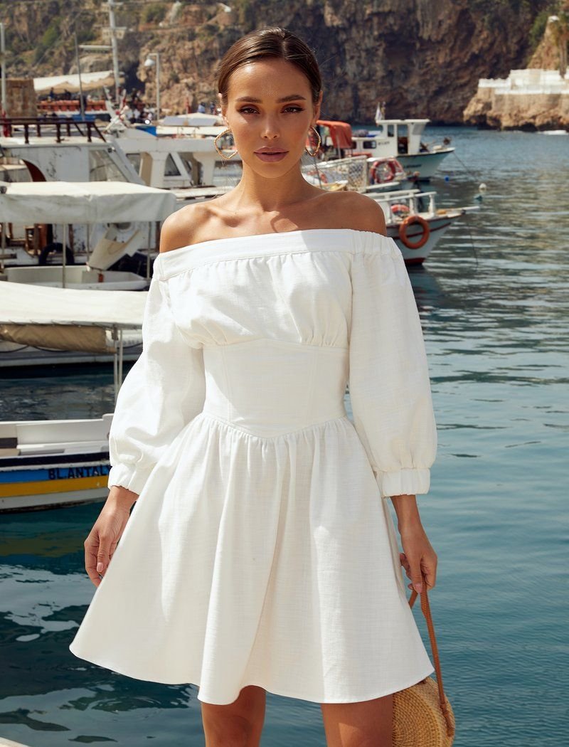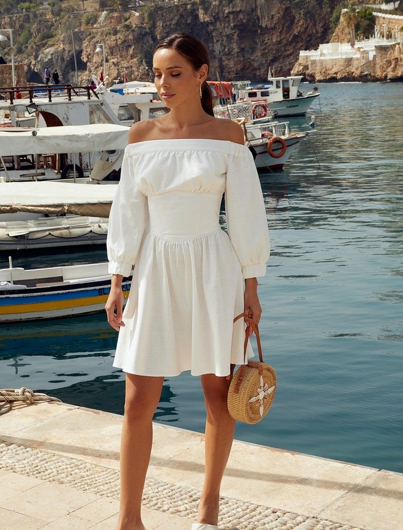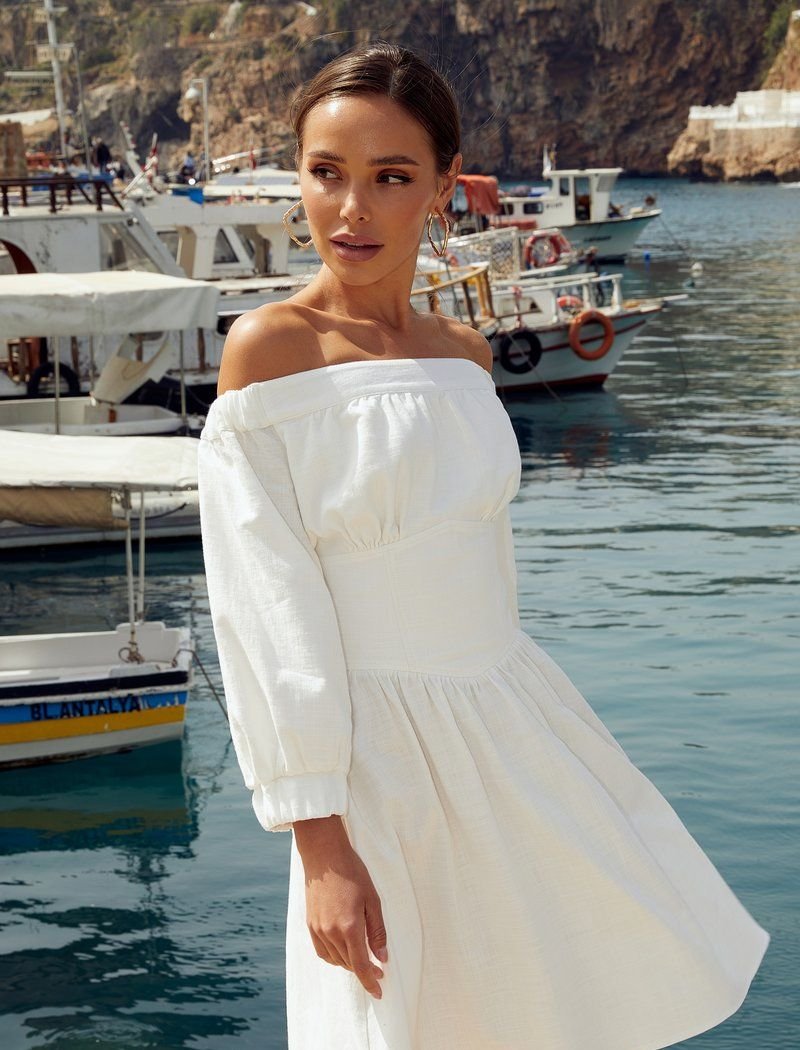 In the case of a white mini dress, Gepur designers combined femininity and comfort. The light cotton material is responsible for the first aspect. And for the second - a wide waistband with a tie at the back, an open shoulder line and voluminous sleeves.