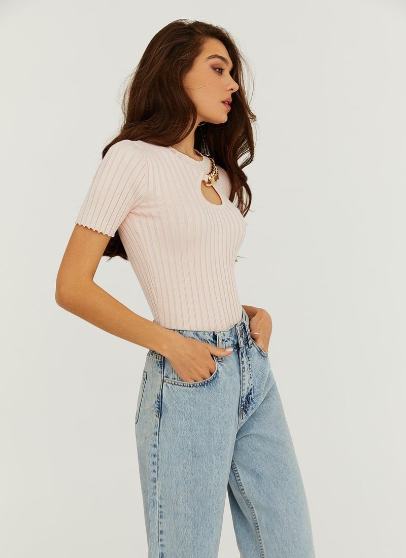 A calm powdery color sets the tone for a crop top. A large golden chain and a teardrop-shaped cutout in the front helps to place accents in the image. The model, which exactly repeats the contours of the body, was sewn from delicate textured knitwear.
