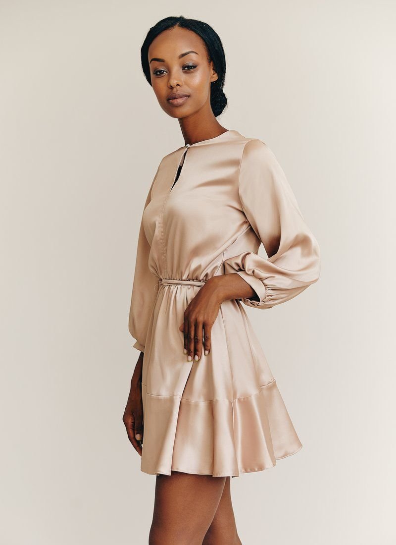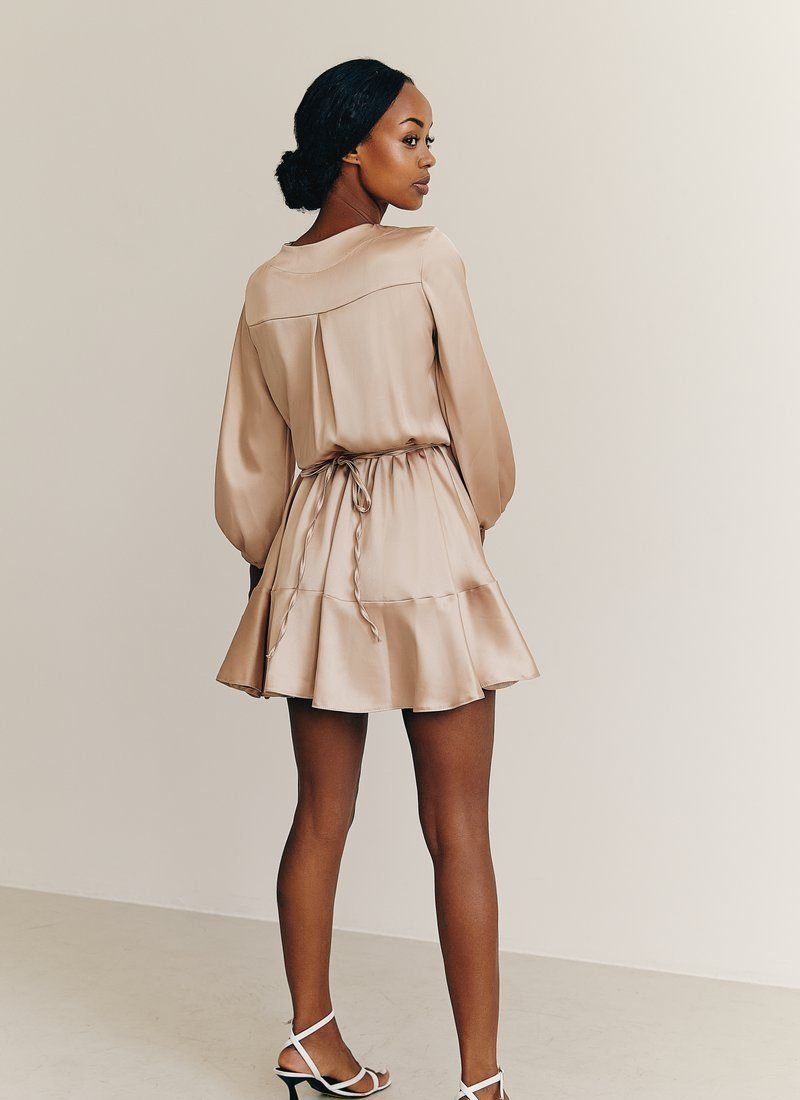 A short beige satin dress with a round neck with a drop on the button. Long loose sleeve with thin cuffs. A dress with a belt in the form of a ribbon made of satin fabric, a skirt with a wide frill.