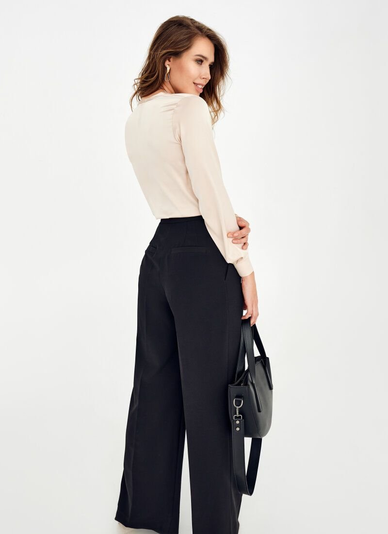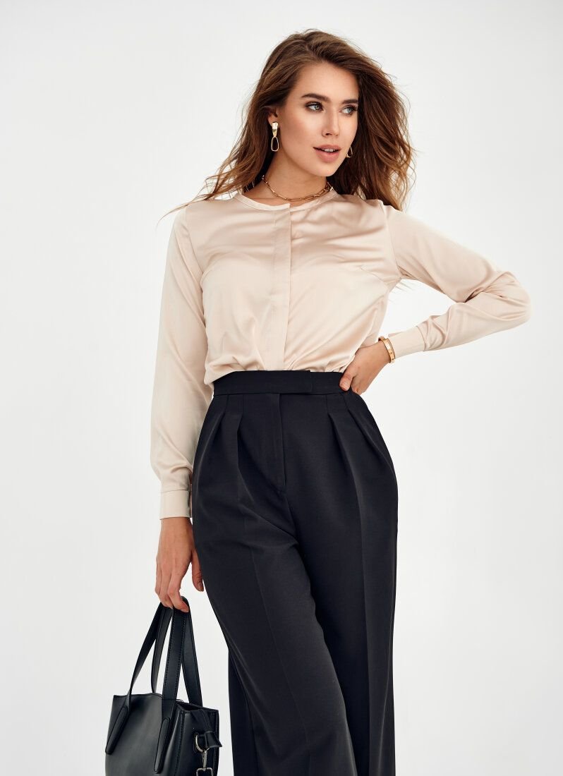 A strict beige silk blouse with a round neck, long sleeves and a hidden button placket in front.