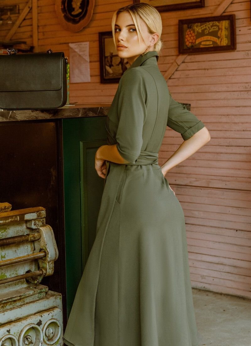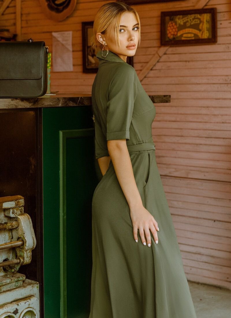 The khaki dress looks feminine with its characteristic delicacy. The medium-length skirt falls in soft waves. The fitted cut for the smell is complemented by a pull-in belt and welt pockets on the hips. The role of decoration is assigned to the turn-down collar and fixed lapels on short sleeves.