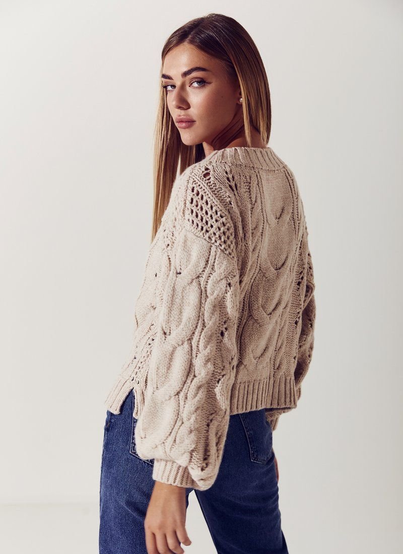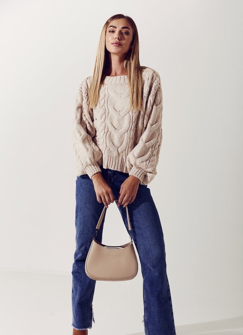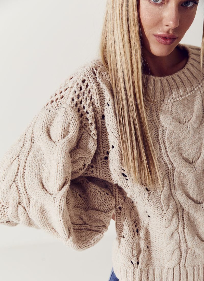 The jumper is made in a delicate beige color from soft knitwear. Trendy puffy sleeves are relevant not only in shirts, but also in knitted sweaters. The trend to add this element to products was supported by brands such as Alexander McQueen and JW Anderson.