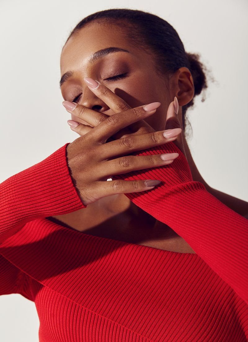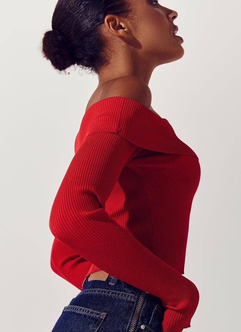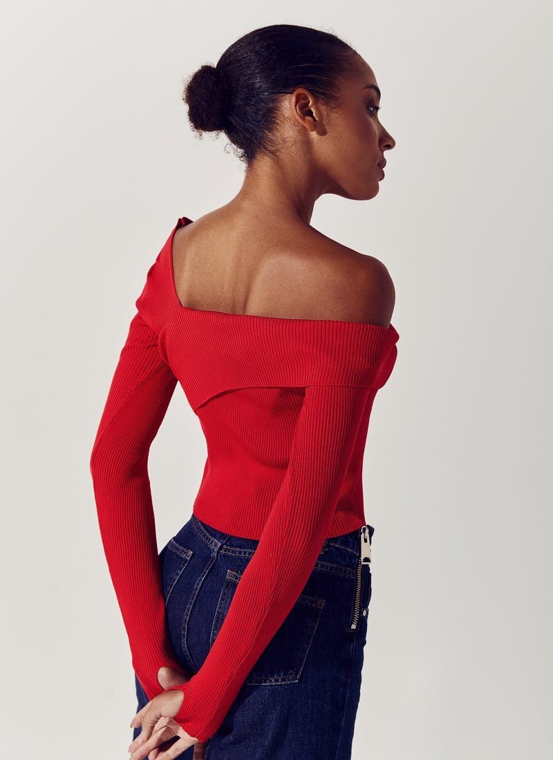 Red cropped longsleeve on one shoulder with a lapel. There are thumb slots in the sleeves. The product is made of knitwear.