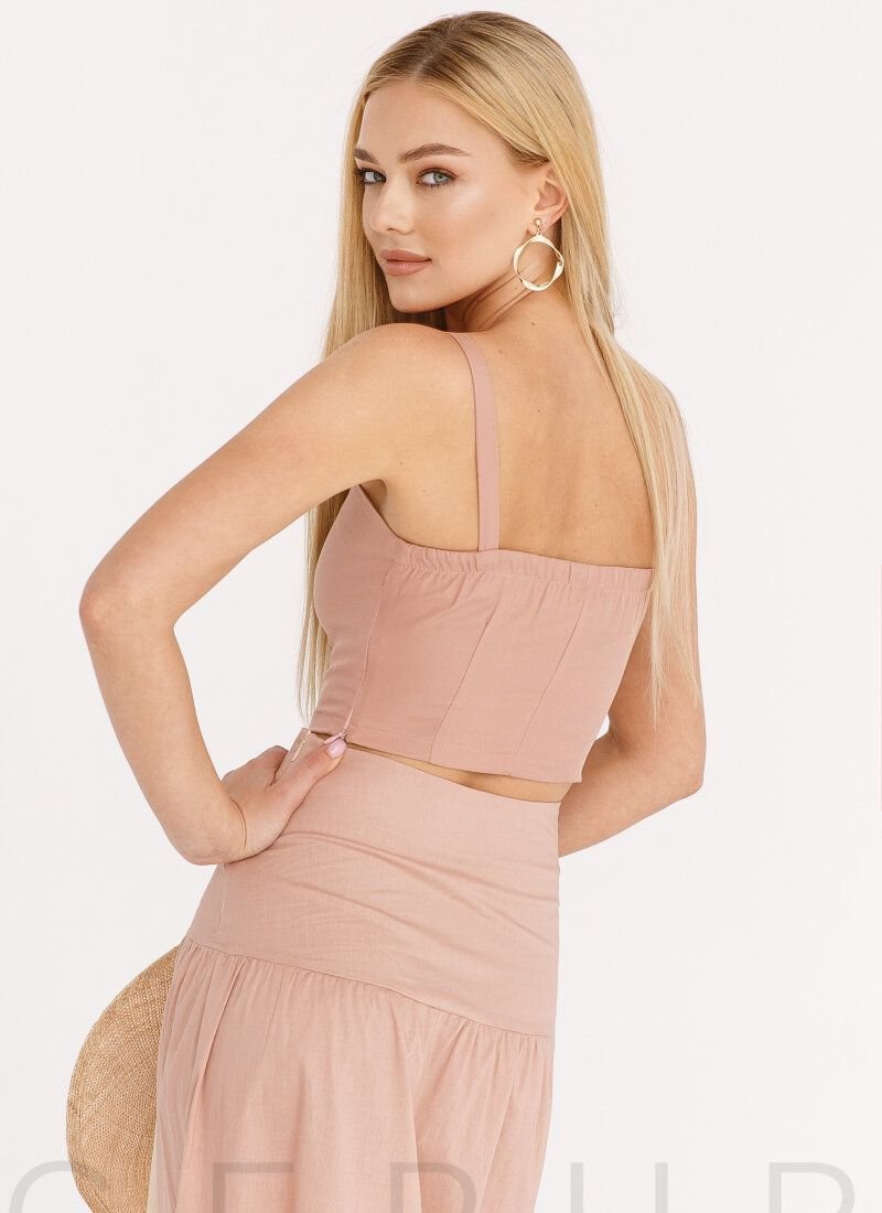 A beige base top made of light fabric with wide non-adjustable straps with an elastic insert at the back.
