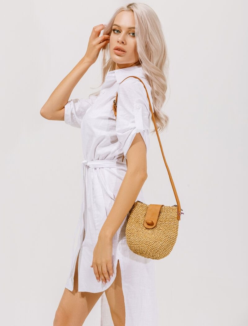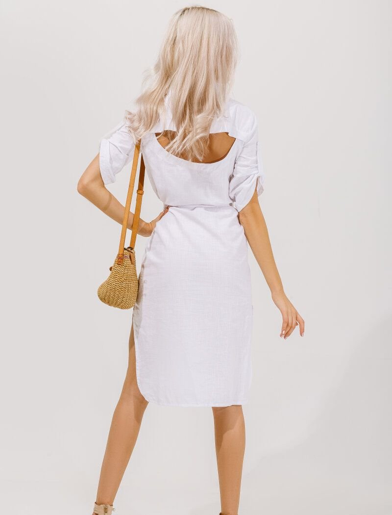 Shirt-dress of the original cut. Patch fasteners on the 1/2 sleeves, a cutout at the back and an elongated back. A removable fabric belt is included.