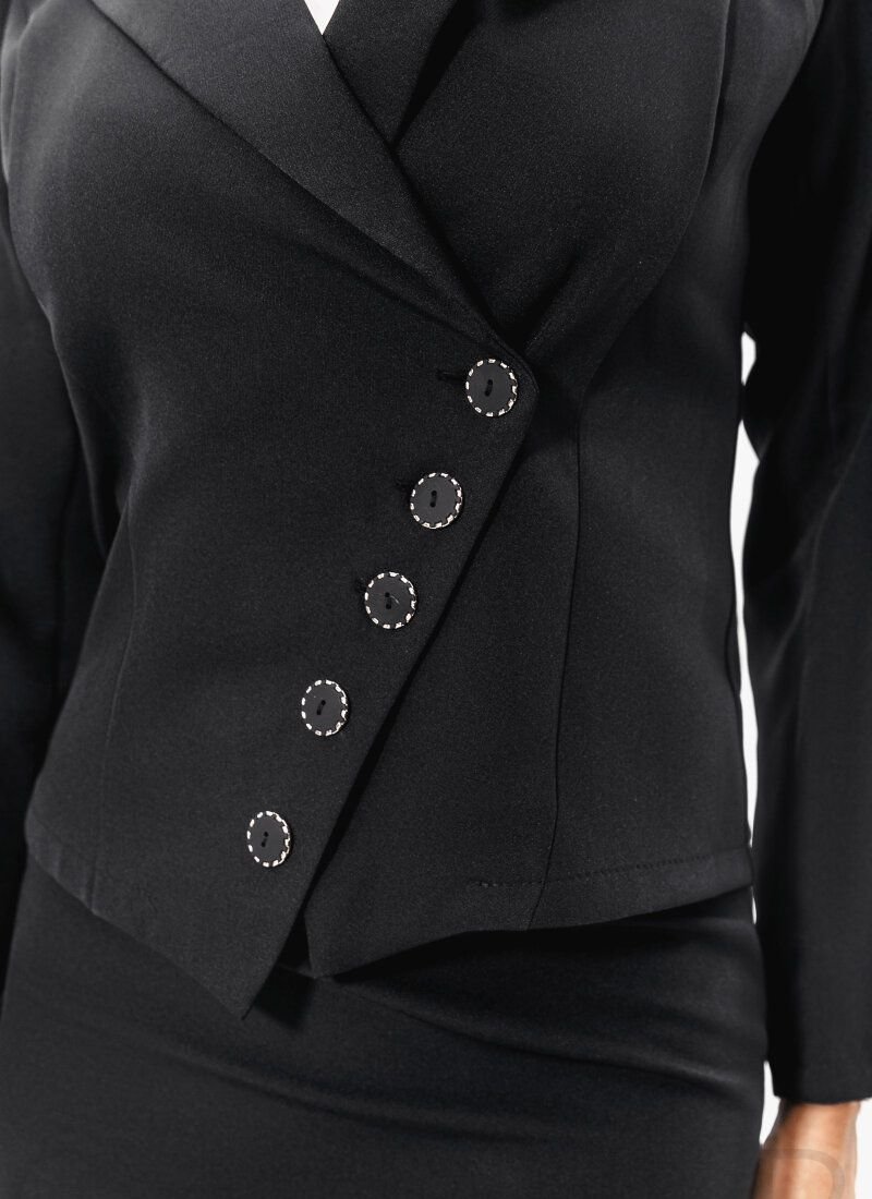 Classic three-piece suit: a jacket with a turn-down collar, lapels, long sleeves, a beveled button line, straight-cut trousers with a high fit and a hidden zipper on the side, a short A-line skirt with a hidden zipper on the back. ..