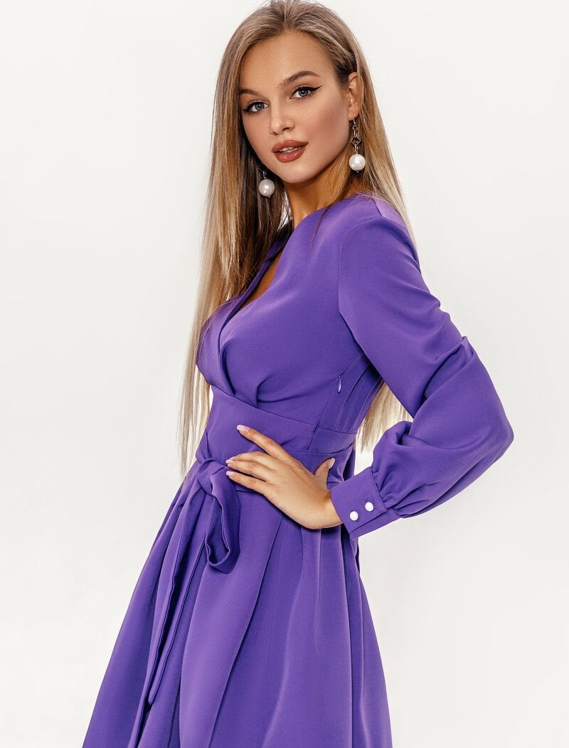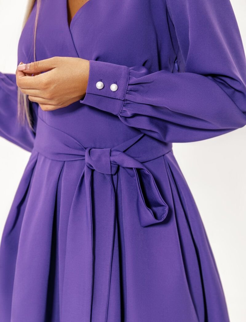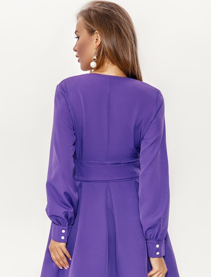 An airy dress for a fixed zipper: a deep v-shaped neckline, a long voluminous sleeve on a wide cuff with snow-white buttons, a wide sew-in belt, a flared mini skirt, complemented by a plain belt.