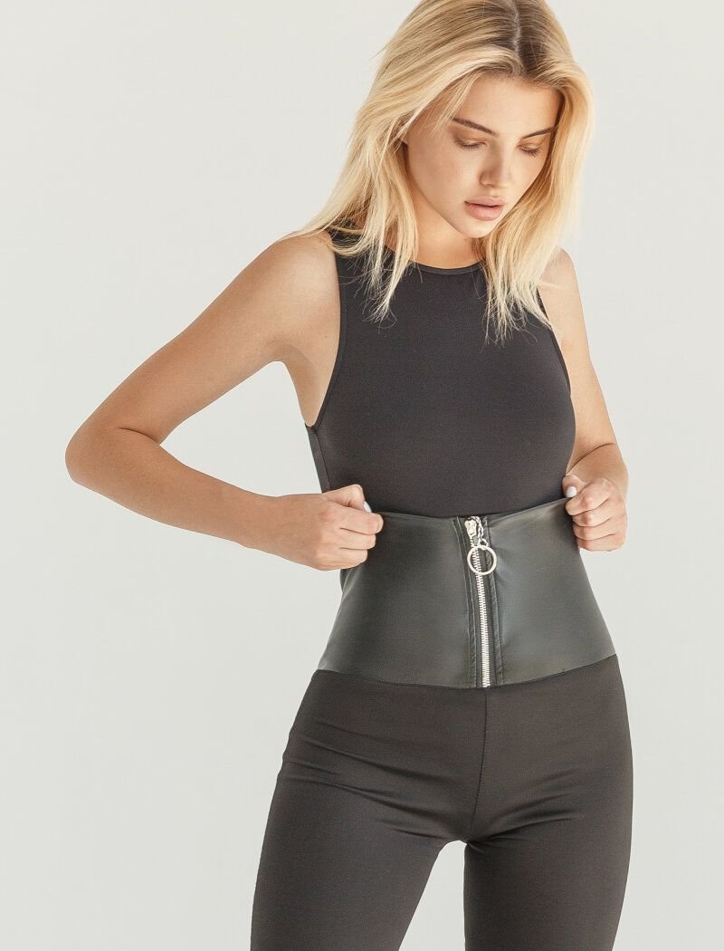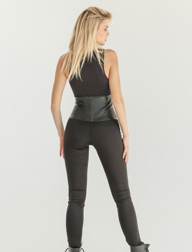 Black leggings are made of soft elastic material. A wide leather belt with a zipper gives a bright accent. Leggings will be an original alternative to classic trousers in smart-casual looks.