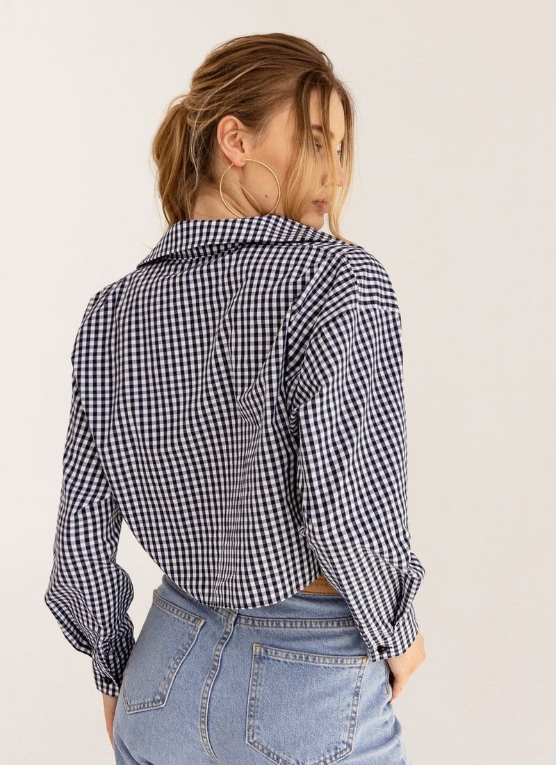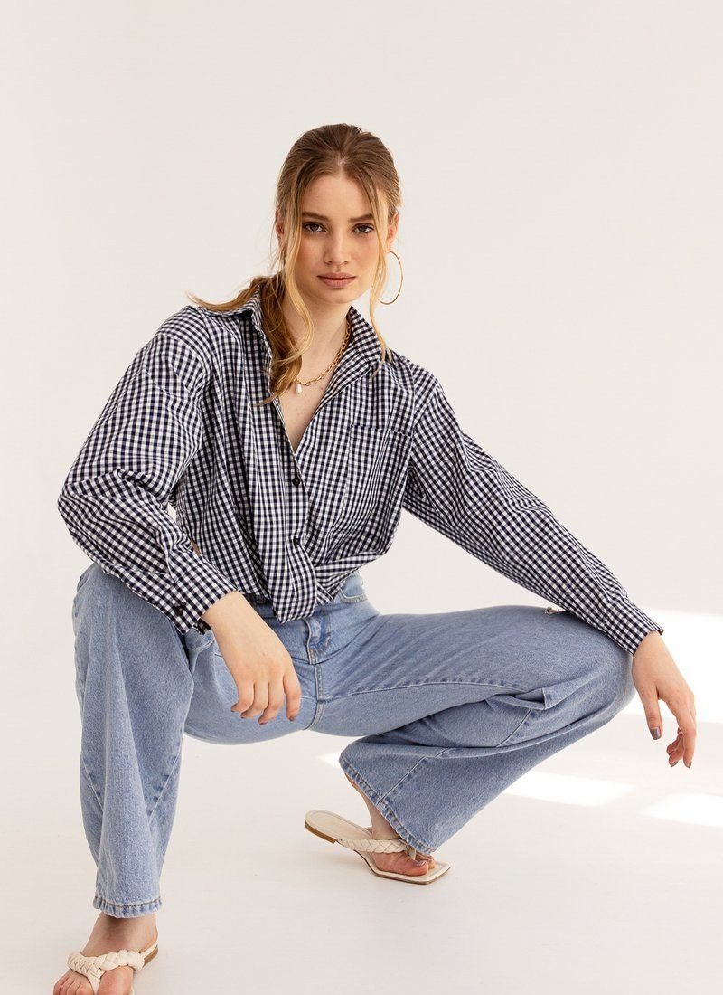 A loose shirt looks quite informal. It's all about the checkered print and the cut with the original overlap on the bottom edge. The model will harmoniously complement the casual look with jeans and mules.