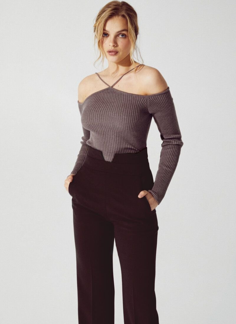 The coffee-colored top supports the trend for knitted models, in the spirit of FW'2020/2021 Fendi and Herm?s. The form-fitting cut was complemented by an open shoulder line with thin straps.