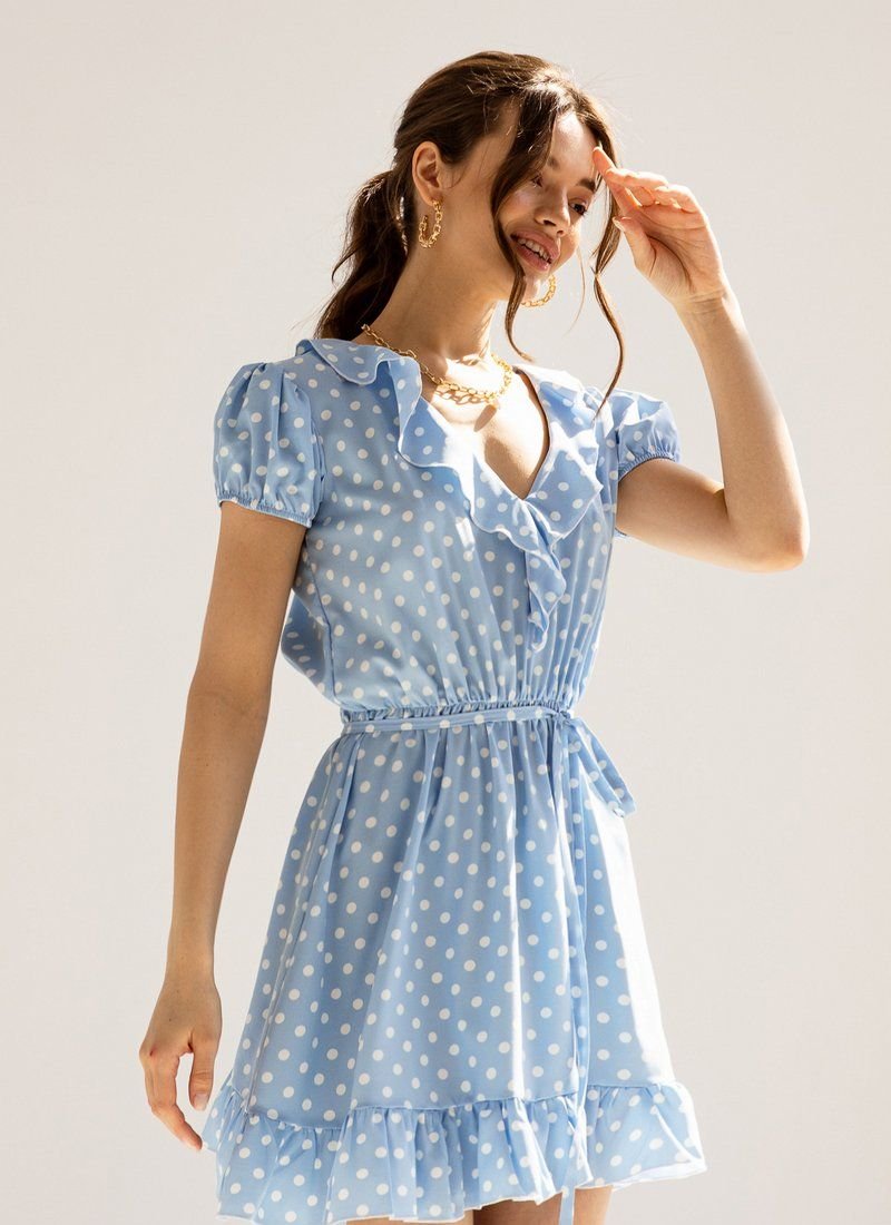 To produce a wow effect, the dress has enough color. The blue shade has acquired a new sound in combination with a universal pea print. The light fabric falls in waves, making the fitted silhouette especially expressive. The designers completed the product with a flounce at the hem and ruffles at the neckline area.