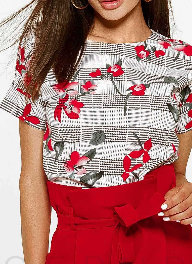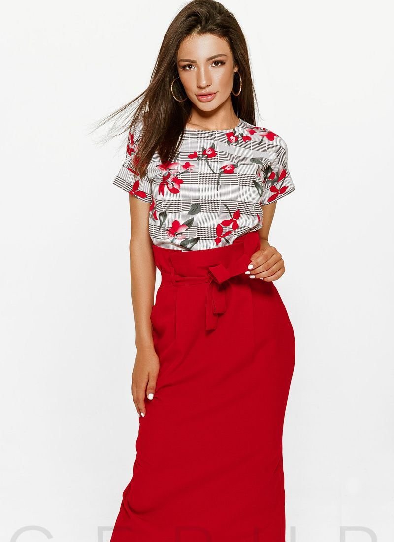 Stylish women's suit: a loose-cut striped blouse, a one-piece sleeve with a fixed cuff and a classic round neck, a skirt made of soft fabric with an inflated waistline, pinches, a belt in loops and a high slit at the back. ...