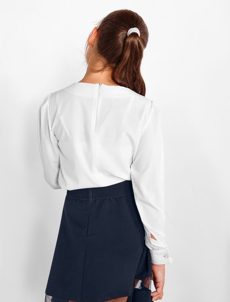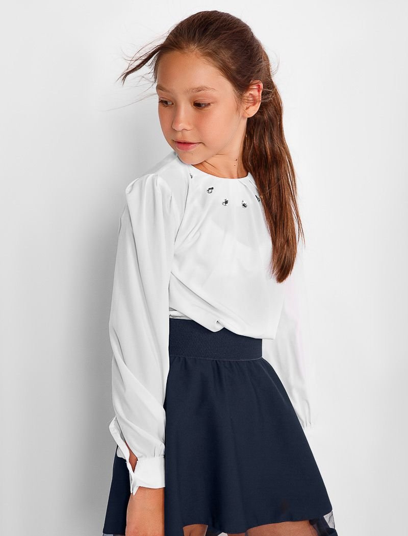 Stylish school blouse with pinched yoke, complemented by large stones.