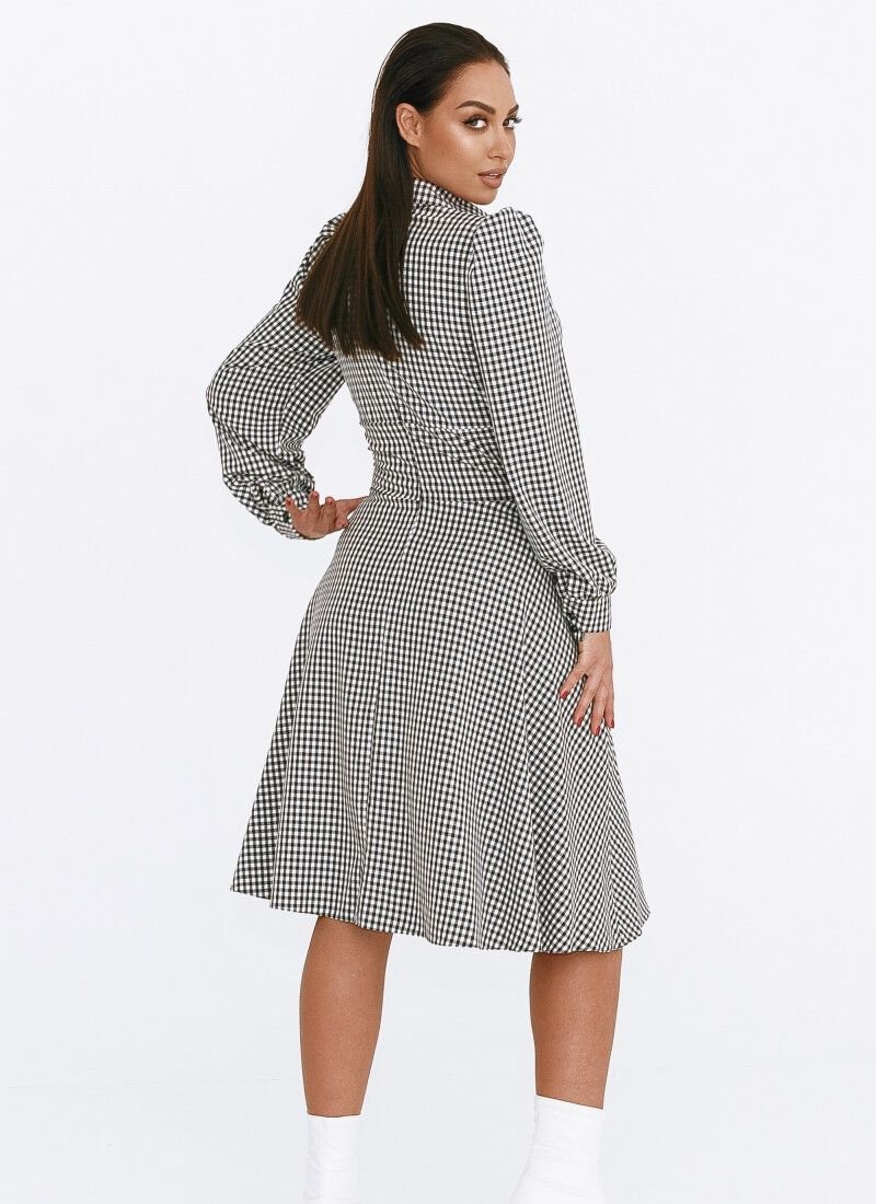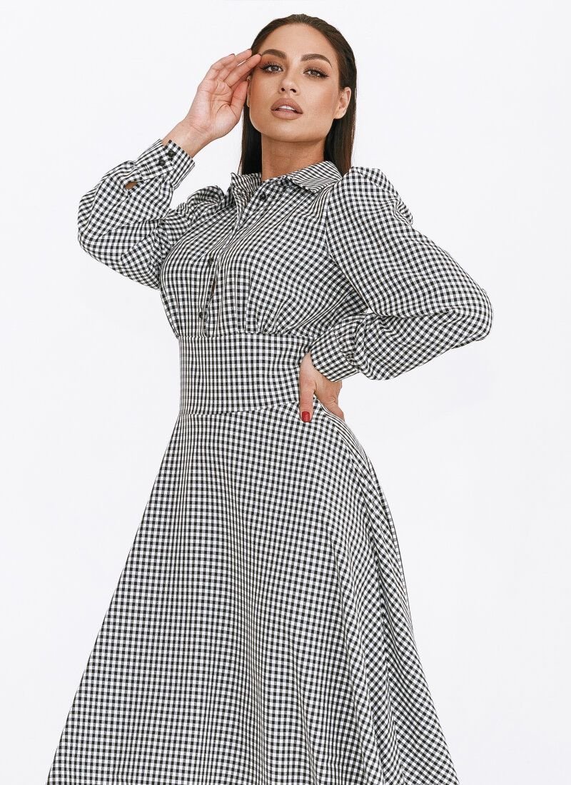 With a plaid dress in a shirt style, it will not be difficult to create an ultra-trendy casual look. A midi model with a wide waistband emphasizes the dignity of the figure and accentuates the waist. The dress is complemented by a turn-down collar, a button placket to the waistline, a long sleeve on the cuff.