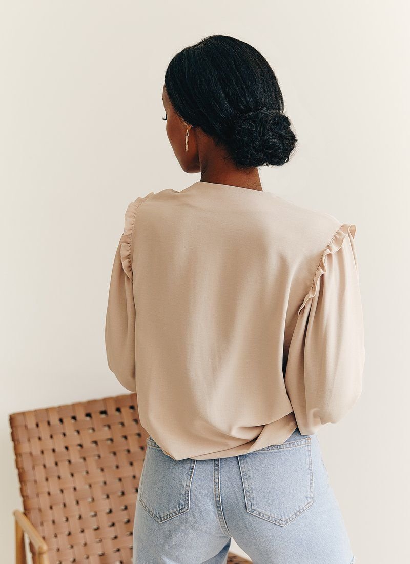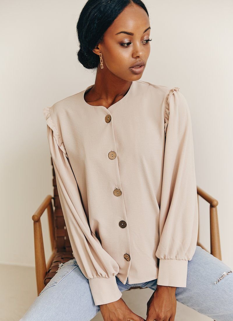 Blouse of a straight cut with a round neck on buttons stylized as wood. The long sleeve at the base is decorated with a thin neat frill, with wide cuffs. This blouse will go perfectly with both trousers and jeans.