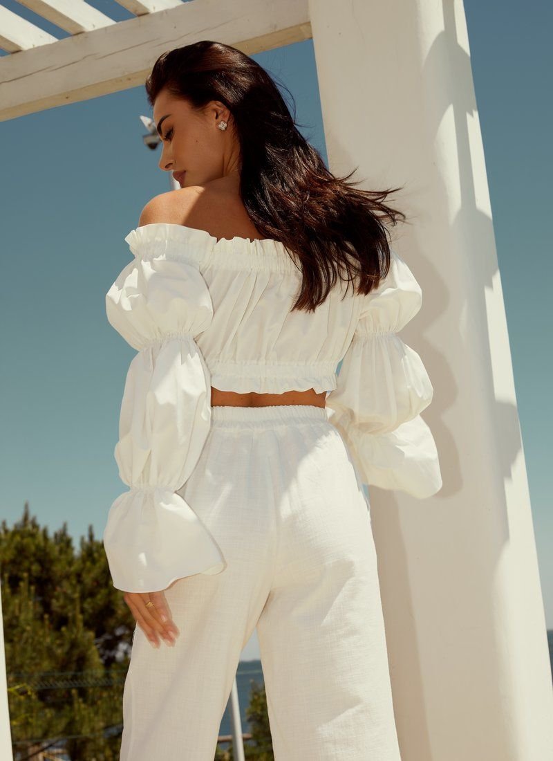 A trendy crop top from Gepur designers, made of milky cotton fabric. The model is distinguished by a deep boat neck with elastic inserts, which allows you to open the shoulders. A spectacular long sleeve with a flounce and ruffle decor are some of the most relevant details of the SS21.