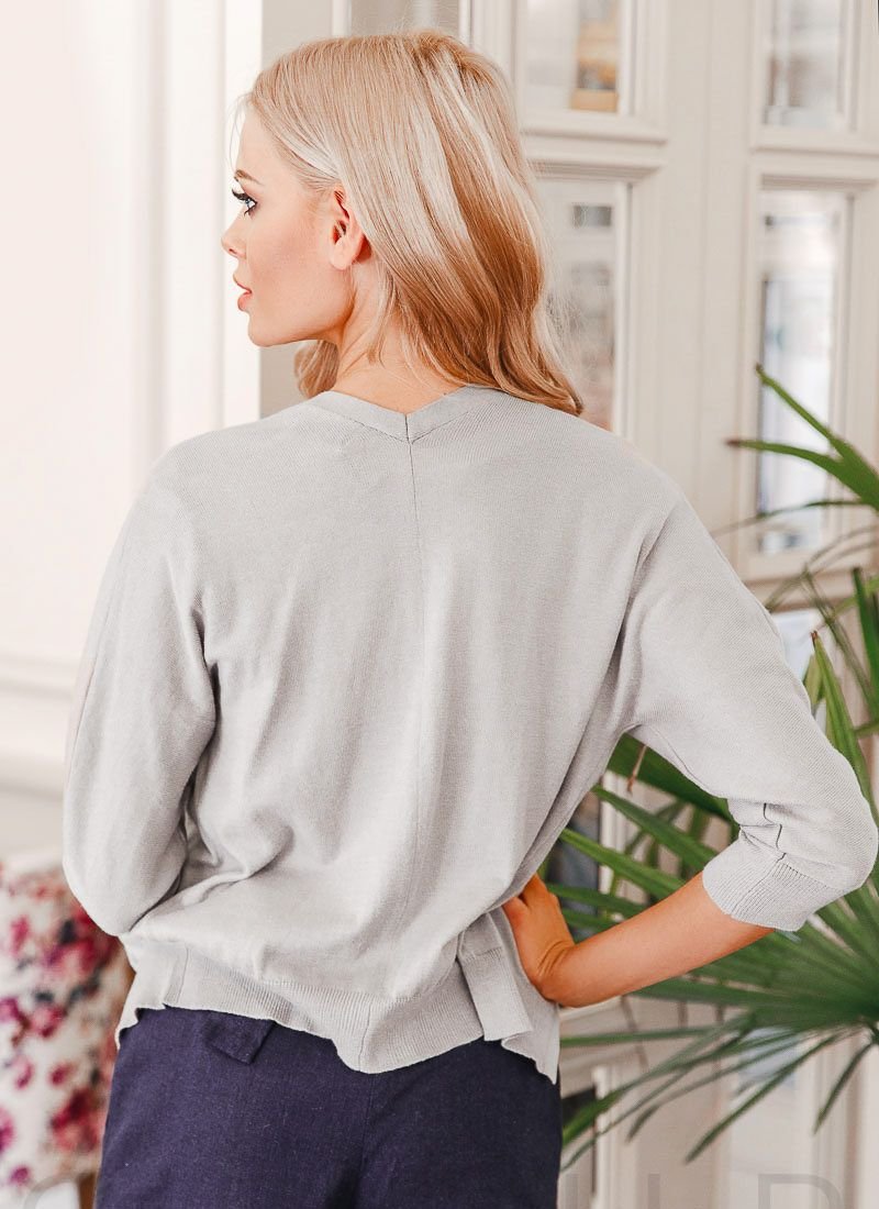 Lightweight cardigan of a shortened model with a small v-neck on the back and a 3/4 raglan sleeve with an elastic cuff.