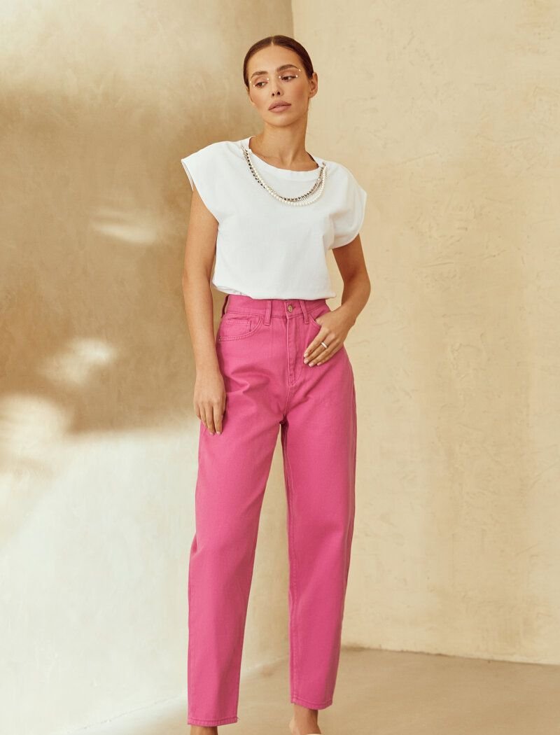 Bright jeans will become a worthy alternative to the usual blue or blue models: a crimson shade will refresh during city walks. For sewing the product, soft cotton was used, which holds its shape perfectly.