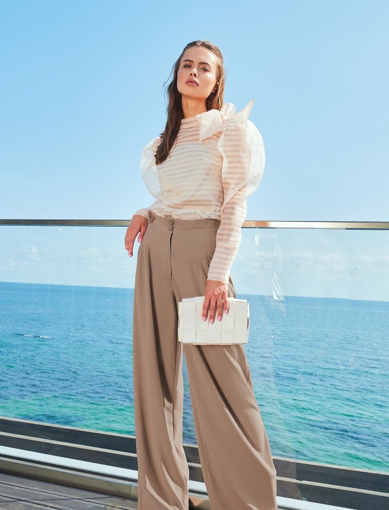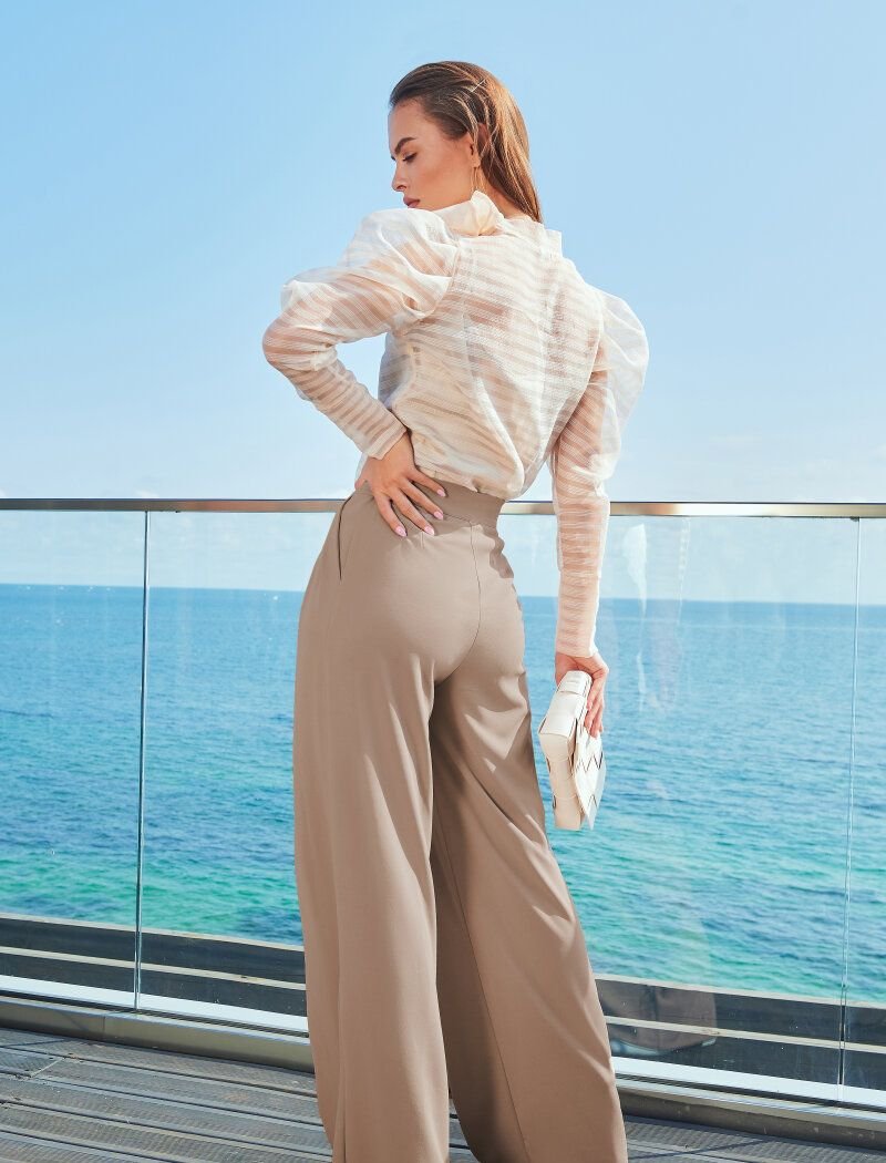 The palazzo trousers are made of a soft, flowing material of a basic beige color. The high fit and pinches on the belt meet the fashion trends of 2020/21 and emphasize the waist.Please note that the color of the trousers has changed (24.11.2020).