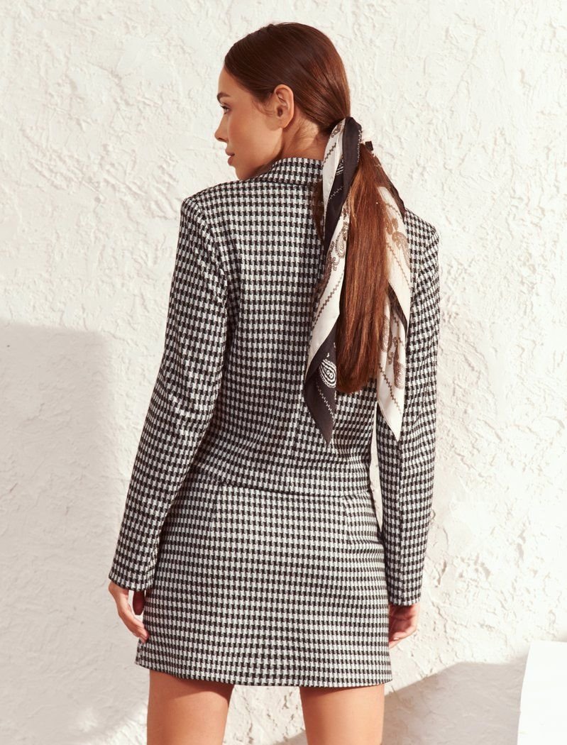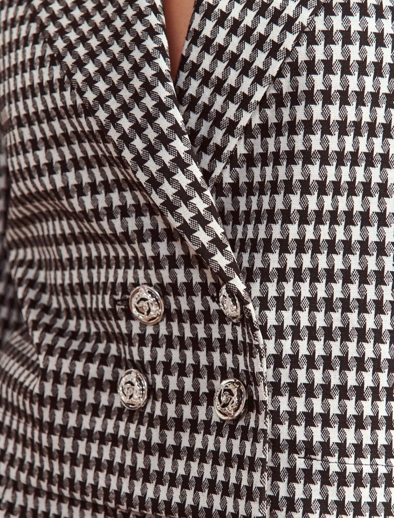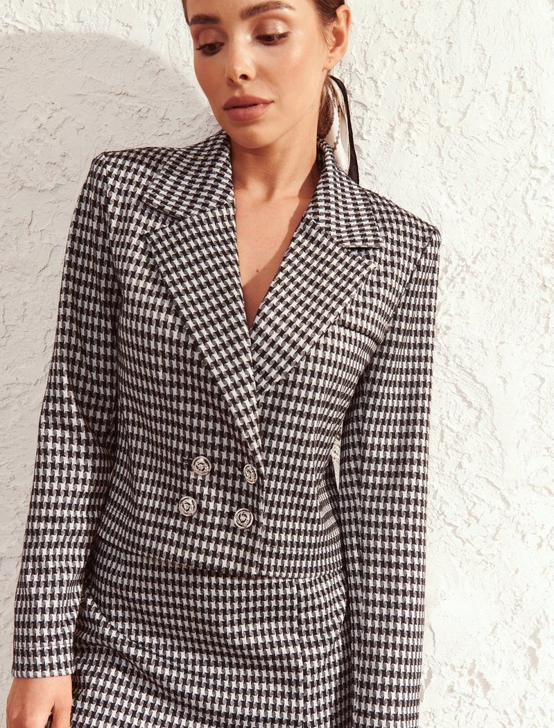 Crop jackets appea#FF0000 on the seasonal shows of FW ' 20/21 at Alexander McQueen and Alberta Ferretti. The double-breasted model of a straight cut is complemented by a turn-down collar with wide lapels. And the main accent of the product was the "crow's foot" print.