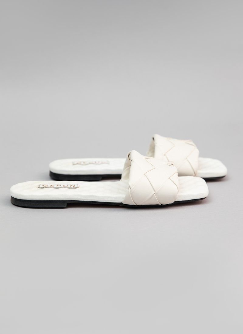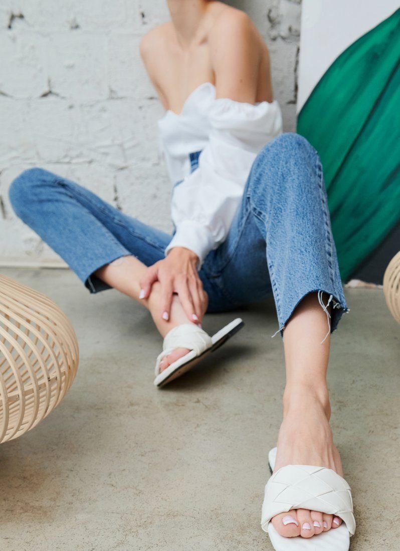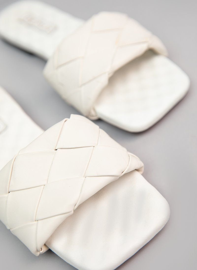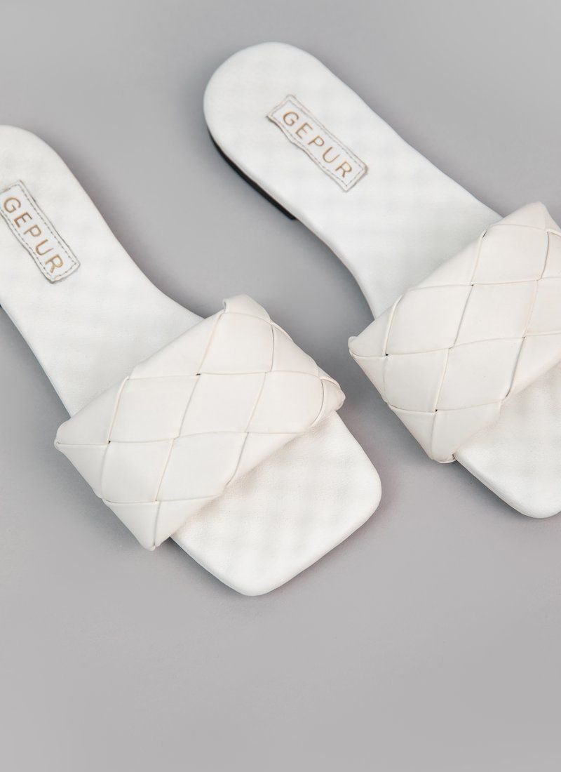 White flip-flops with an open square toe and a low heel will make friends with a casual outfit. The voluminous strap is made in the intrecciato weaving technique of wide strips of artificial leather, in the spirit of SS'21 Bottega Veneta. The insole is made of genuine leather.