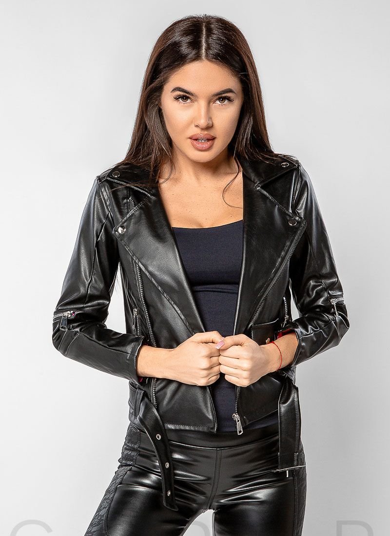 Trendy leather jacket made of eco-leather: turn-down collar, epaulettes, welt pockets with zipper, long sleeve and belt loops with metal buckle. .