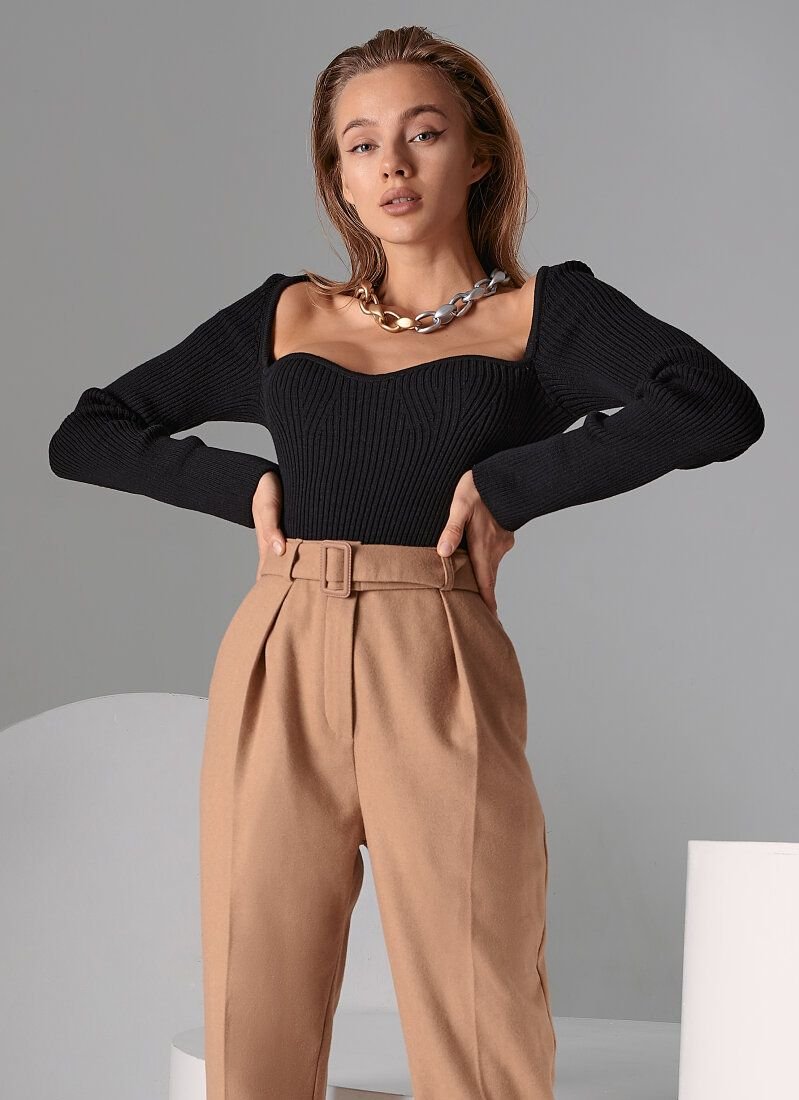 A black jumper made of textured ribbed knitwear is complemented by a curly neckline, which puts an emphasis on the decollete area. The form-fitting cut of the model emphasizes the silhouette.