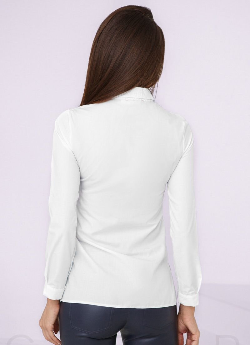 Office-style shirt: strict turn-down collar, slightly elongated back, small slits on the sides and diagonal button closure.