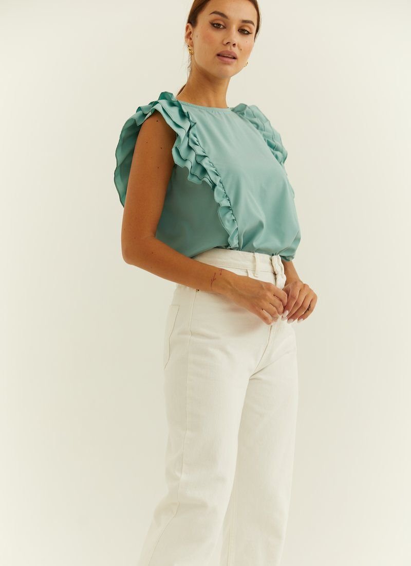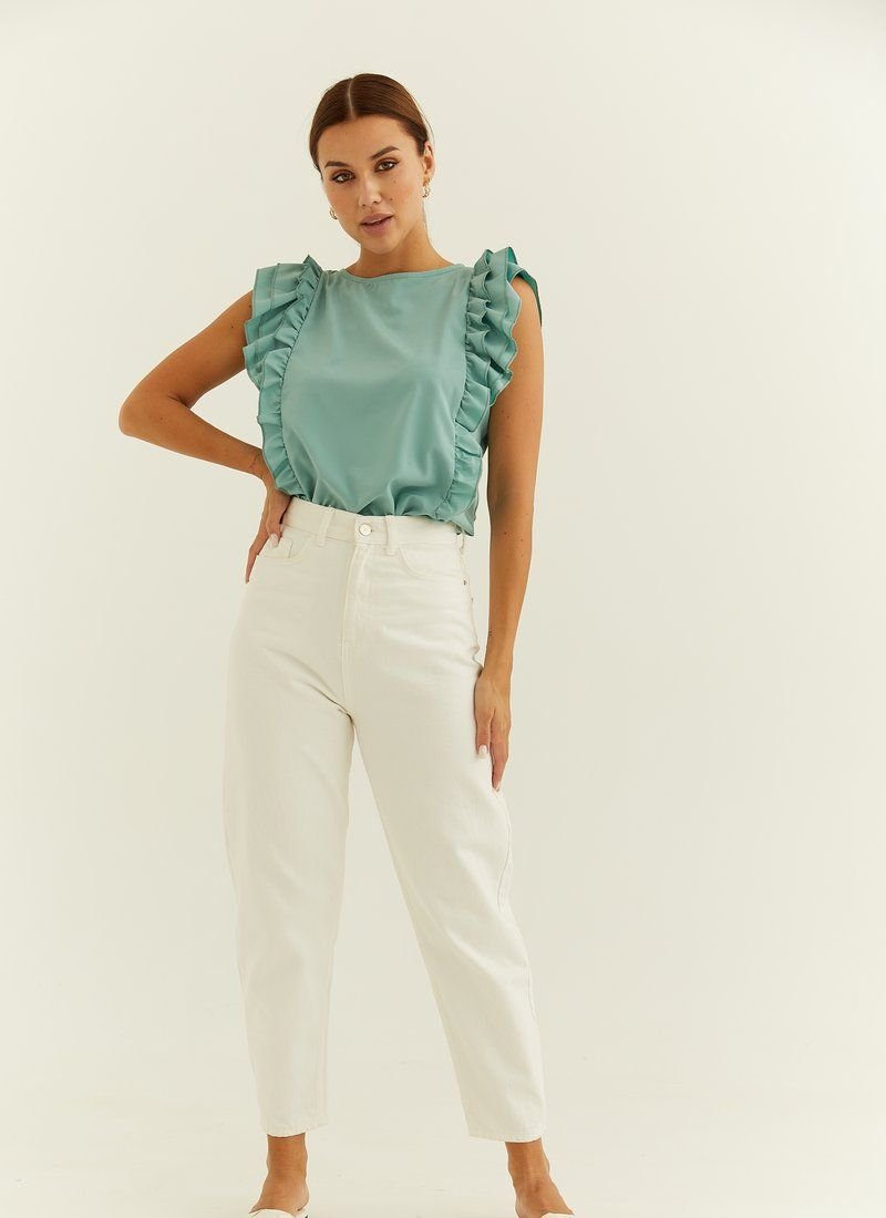 A light sleeveless blouse decorated with ruffles and ruffles. The model is made of light flowing fabric.