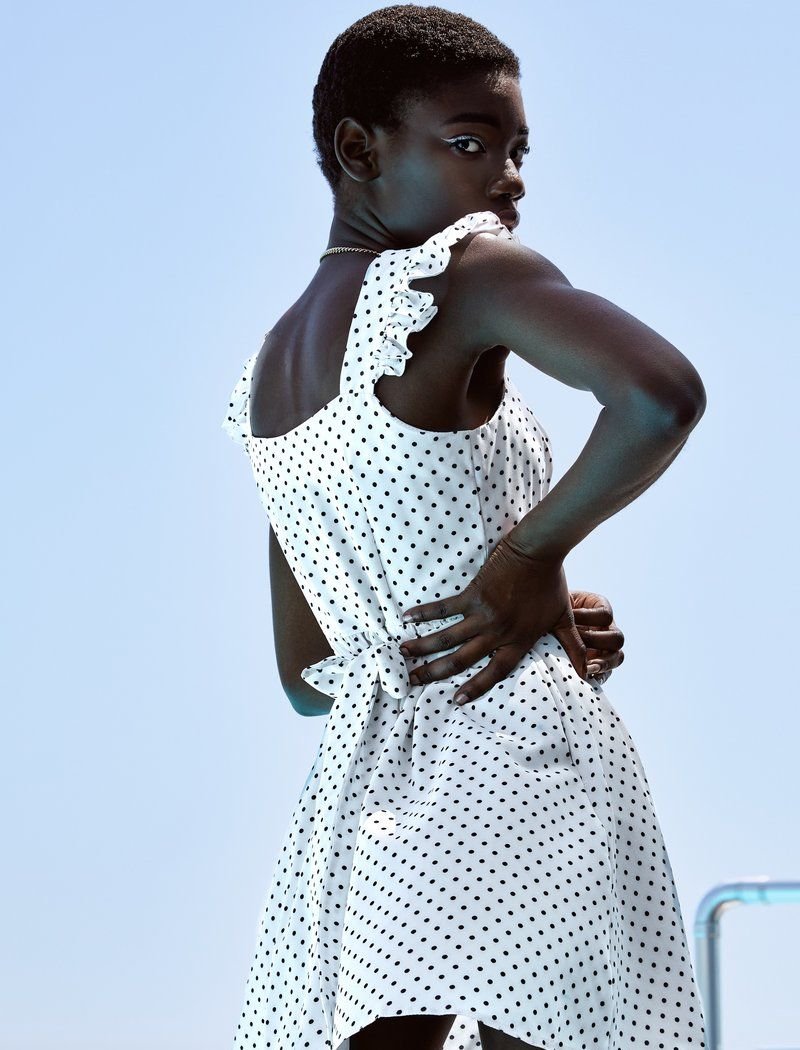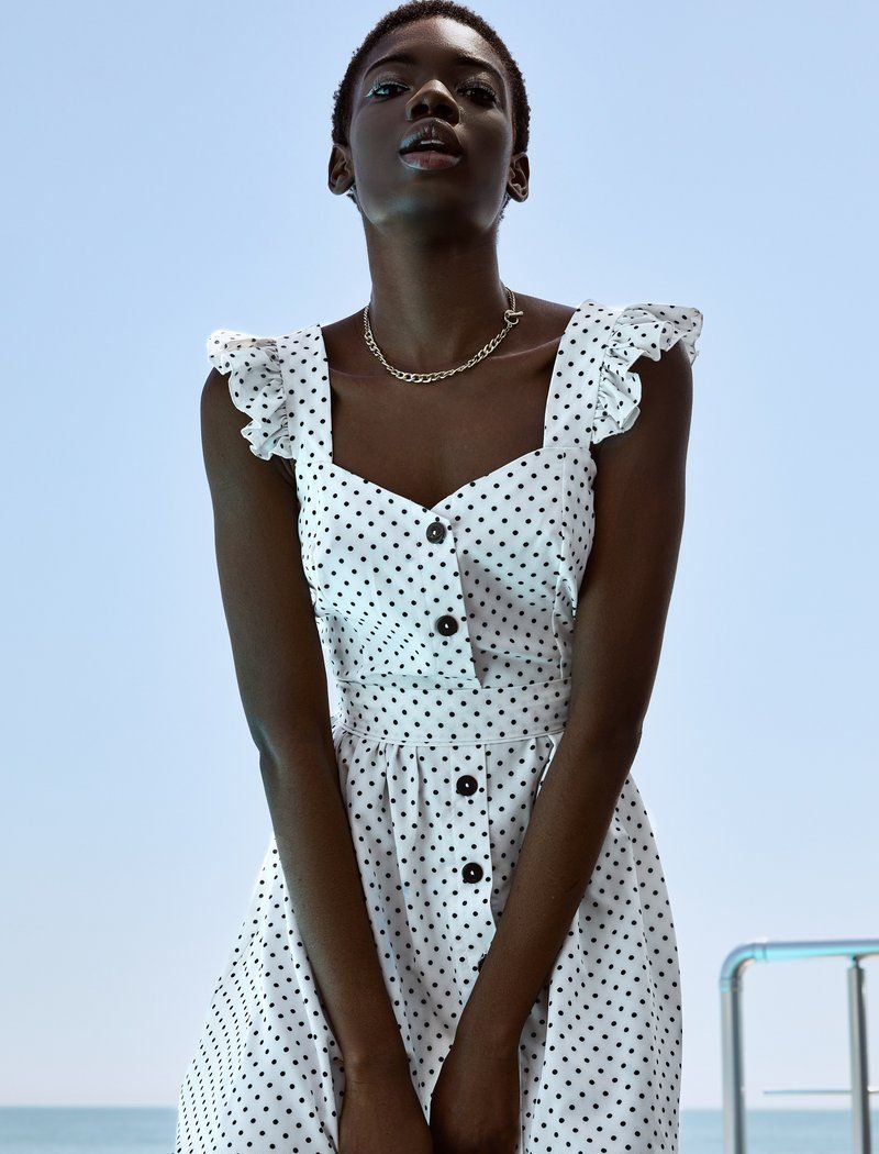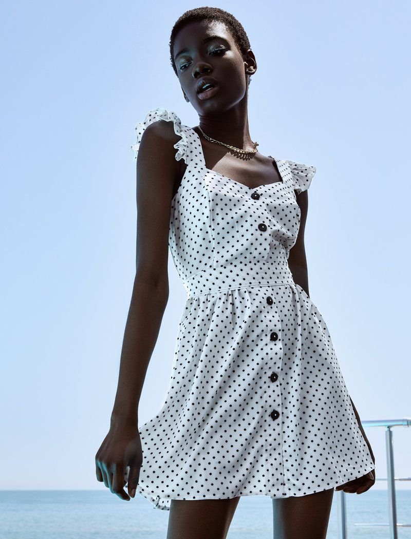 Polka dot is a versatile print that easily gets along in different styles: from restrained and elegant to fun and relaxed. A fitted white sundress in small peas belongs to the latter. Wide straps are complemented by ruffles. The set includes a belt-ribbon that puts an emphasis on the waist.